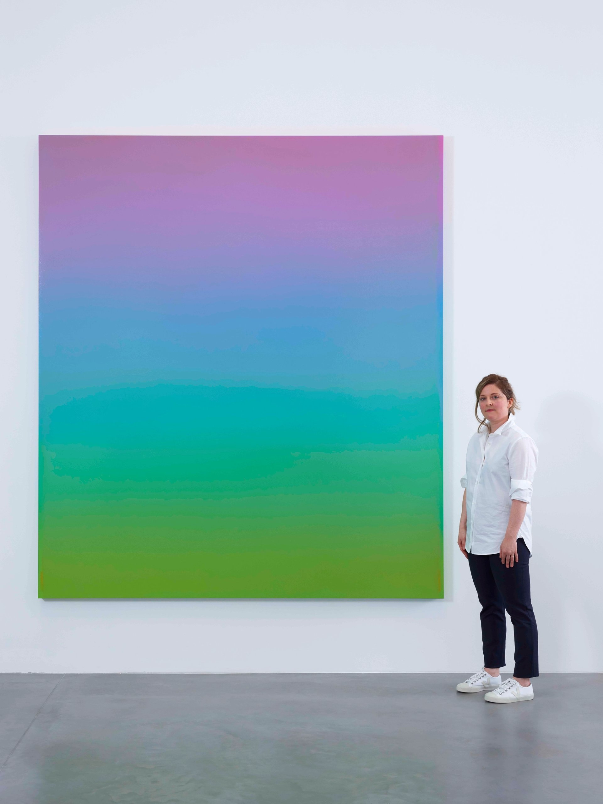 Hirst also enabled Saville to produce her largest ever colour field painting. “I’ve wanted to work bigger for ages but there are challenges with working at that scale,” she says. “Lots of those challenges are practical ones and you need a certain level of infrastructure to make it possible.” Saville creates her colour field canvases by applying up to 30 layers of paint and then sanding them back to achieve a flawless, shimmering surface.