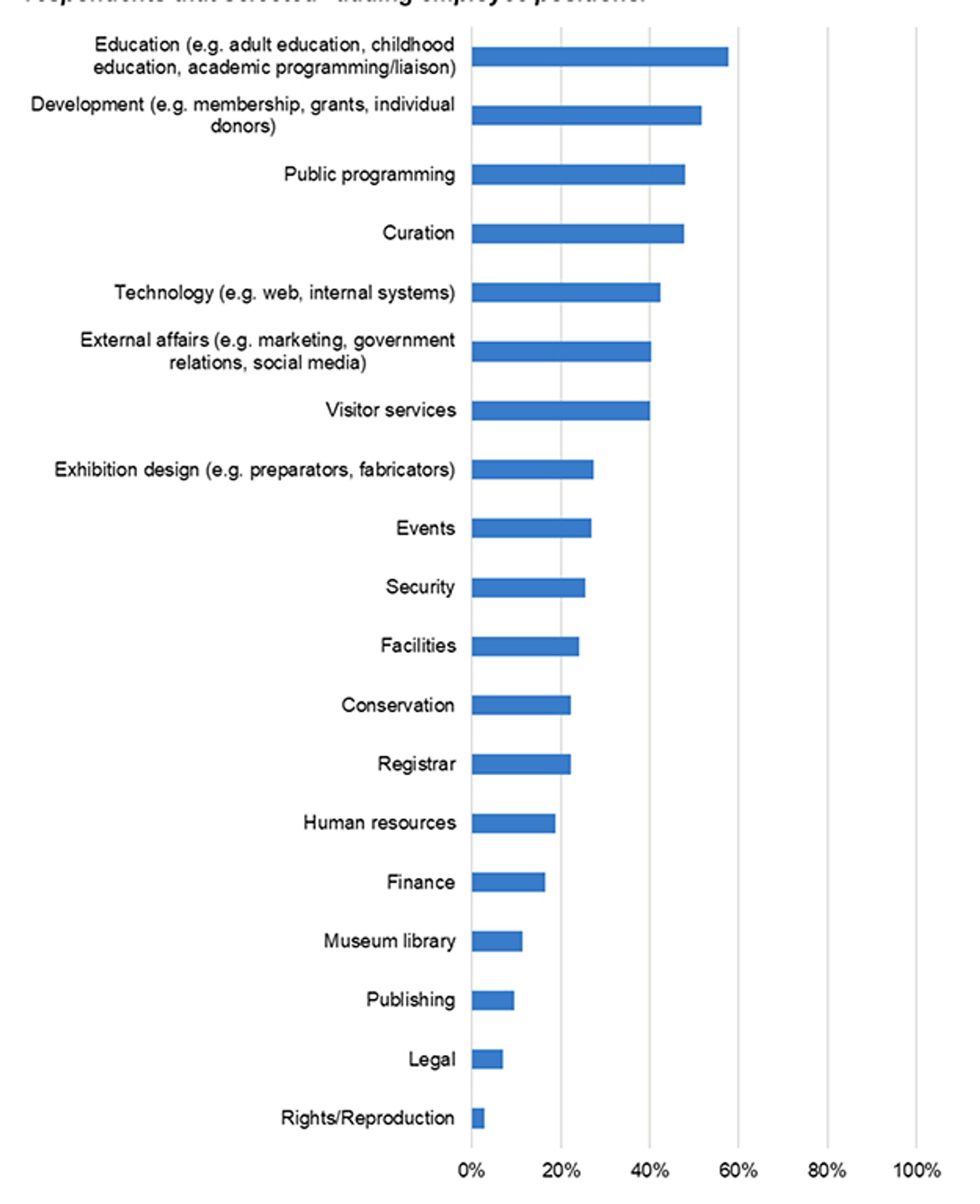 Responses from museum directors to the question “To the best of your knowledge, will your museum add or reduce employee positions in any of the following areas over the next five years?” Percentage of respondents that selected “adding employee positions” Ithaka S+R Art Museum Director Survey 2020 by Liam Sweeney and Jennifer K. Frederick