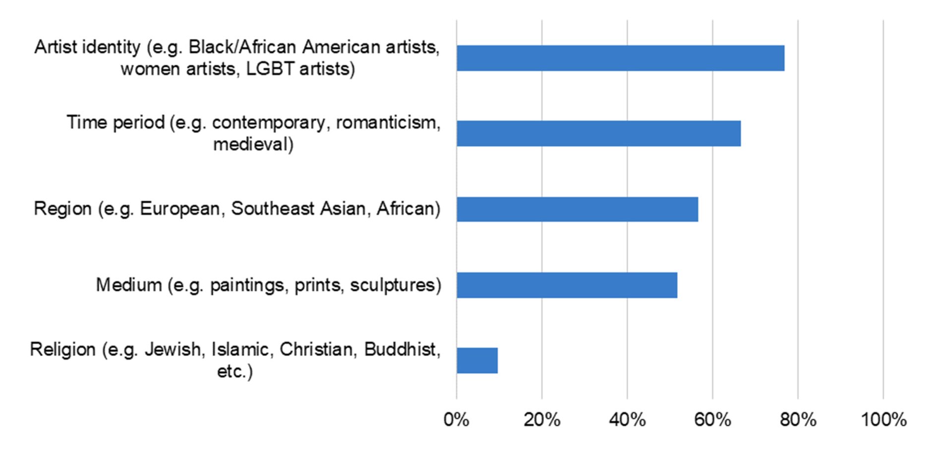Responses by museum directors to the question “When making decisions about which artwork to acquire at your museum, which of the following do you prioritise? Select all that apply.” Percentage of respondents that selected each item Ithaka S+R Art Museum Director Survey 2020 by Liam Sweeney and Jennifer K. Frederick