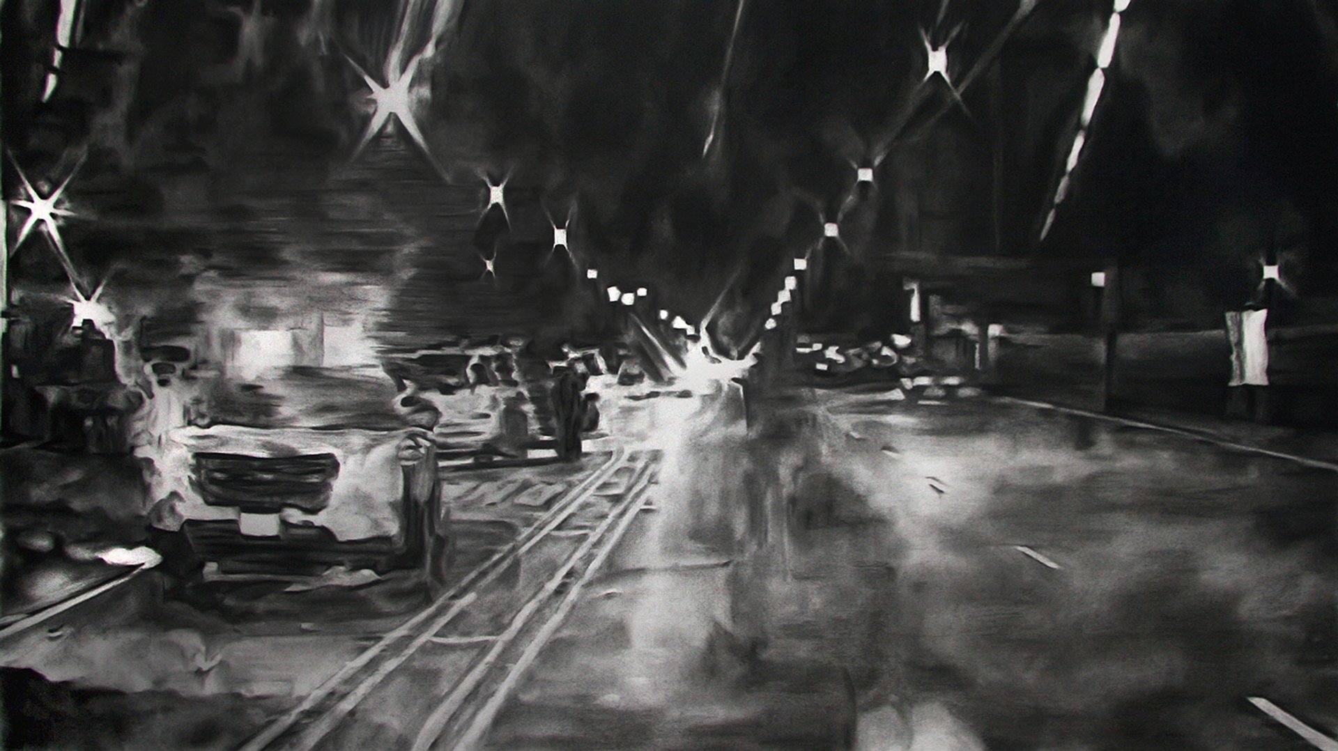 Another work by the artist, consisting of two images, records the 2014 killing of Laquan McDonald by a Chicago police officer, based on dashboard camera images. “In the first image, what you see is a manipulation of an image in which all you can take in and internalise is the row of police cars that at that scene dealing with a single Black body,” the artist says. That led to the second drawing, in which Leonardo emphasises that McDonald was simply walking down the street when he was shot—and underlines the long range at which the officer chose to shoot.