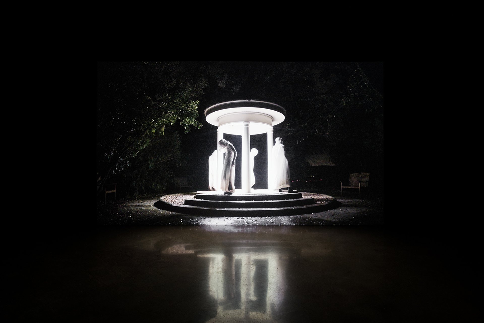 The first piece visitors encounter in the show is White House Painting (2018), a heavy vinyl curtain which McMillian has hand-stitched in the outline of the White House façade. To get to the next room, they must lift the work and squeeze past it to watch Untitled (neighbors) (2017) an 18min video in which four dancer's from Ballet Austin, cloaked in white sheets that heavily recall KKK robes, perform movements choreographed by McMillian as they gather around a columned gazebo in the woods. Both installations play on what Pesanti calls the "architecture of power". "These neo-classical, imposing Italianate façades direct and subjugate people and keep you contained and keep you controlled and keep you feeling tiny," she says.