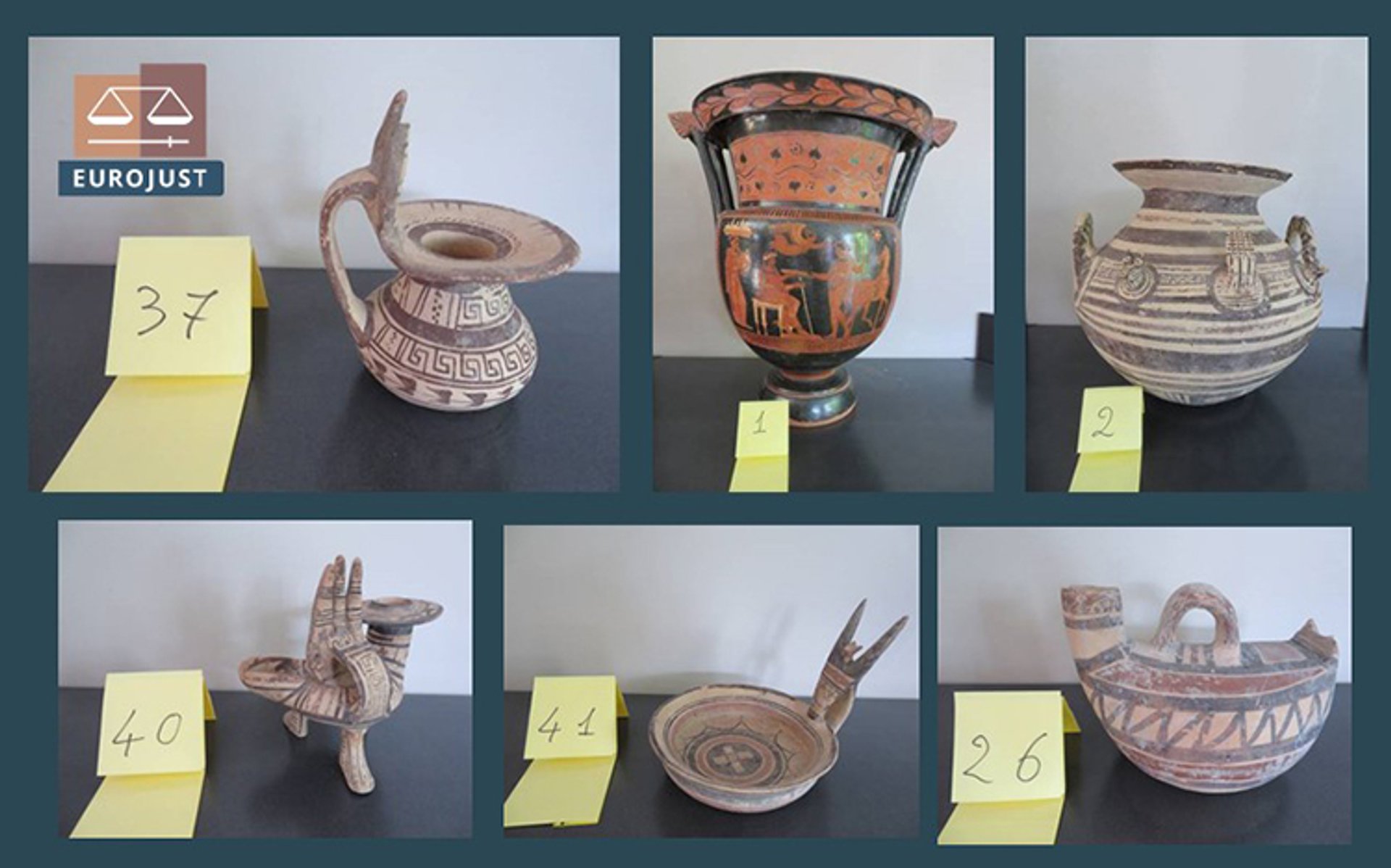 The discovery includes vases painted with red figures typical of Puglia, amphorae, black glazed ceramics, terracotta figurines, and further limestone stelae Courtesy of Eurojust