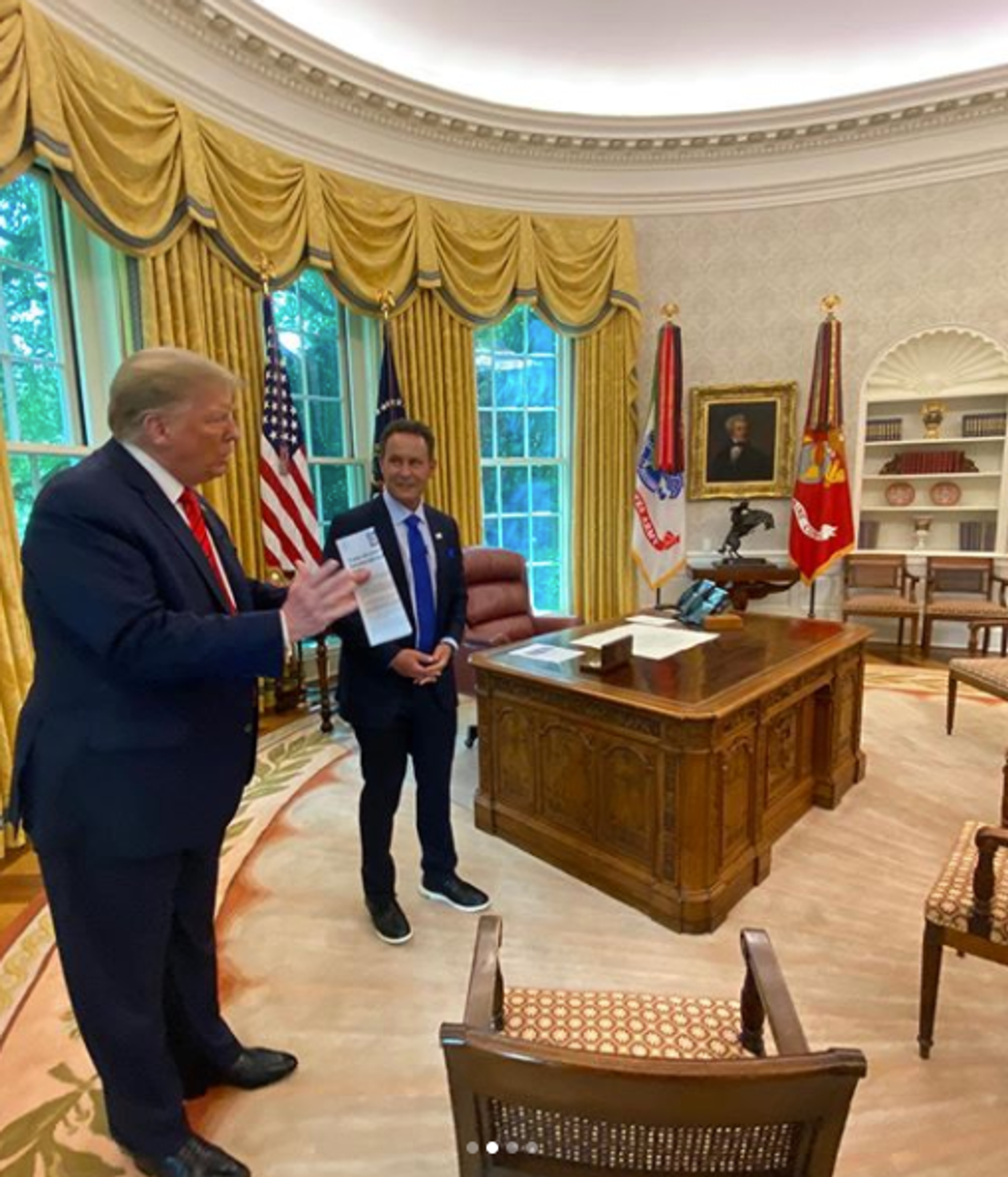 Fox News host Brian Kilmeade stands in the Oval Office with Trump, where Remington's sculpture can be seen in the background. Brian Kilmeade/Instagram