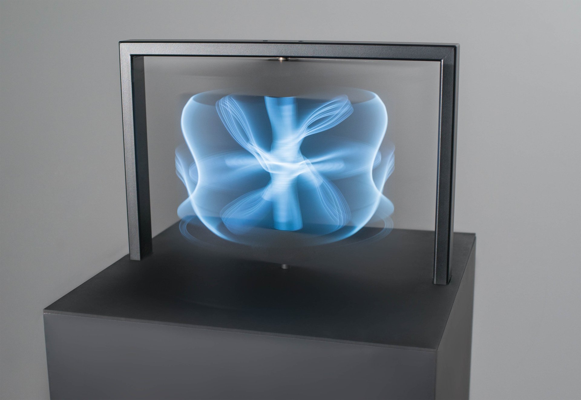 Sometimes the art in New Frontier has more to do with science than any traditional media. Such is the case with Full Turn by the Swiss artist Benjamin Muzzin, who stuck two flat-screen tablets together and put them on a machine that spins at high speed to create a hologram. “The rotation is fast enough to give you the illusion of a 3D image,” Muzzin says. “My idea was to get moving images from a screen, to put them into real life, and to give them some fake materiality.”