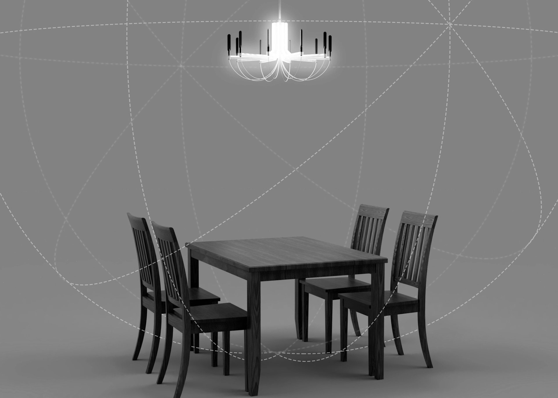 Made of brass, LEDs, and glowing translucent acrylic, the prototype for the chandelier has radio frequency-jamming antennae attached visibly beneath each arm. The concept was awarded Honorable Mention in the Arts and Design category of Fast Company’s 2021 World Changing Ideas Awards.