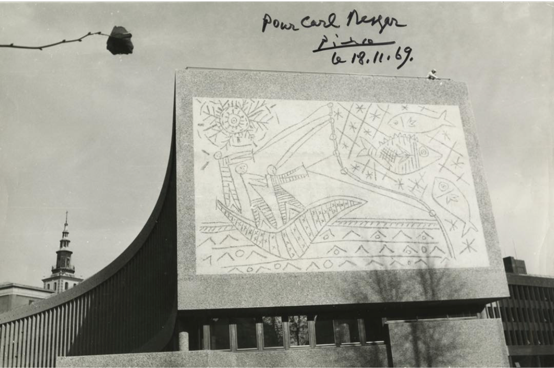 The brutalist Y-Block, which was designed by the Norwegian architect Erling Viksjø in 1969, features two murals designed by Pablo Picasso sandblasted onto its concrete walls: The Fishermen on the building’s façade and The Seagull located in the lobby. The murals were executed by the Norwegian artist Carl Nesjar. An adjacent 1958 building also designed by Viksjø, known as the H-Block, contains three small interior murals by Picasso and Nesjar.