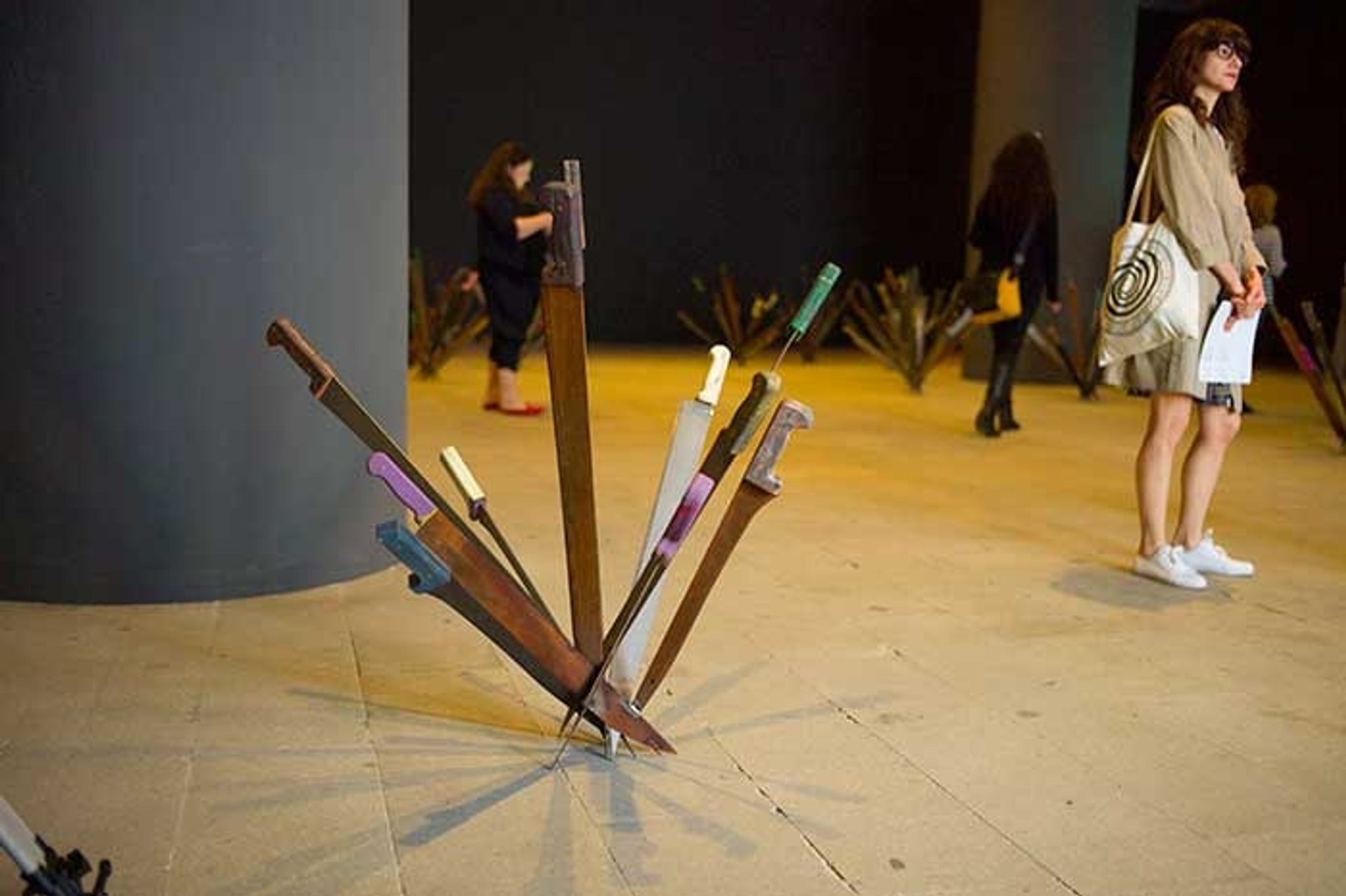 Likewise, most of the work made from weapons (or made to resemble weapons) does not go far enough. Adel Abdessemed’s stacked swords (Nympheas, 2015), Pino Pascali’s artillery gun (Cannone semovente, 1965) and Monica Bonvicini’s hanging chainsaws (Latent Combustion #1, 2015) are all handsome pieces, but they are inoffensive. They only suggest violence instead of bathing us in it. It is impossible to be afraid of these modestly-sized sculptures. Even otherwise strong work by a good artist like Melvin Edwards does not do enough in this context. Although his finely-fashioned abstract sculptures are made of axes and chains, they are not frightful, nor do they try to be. They are just simple, lovely objects.