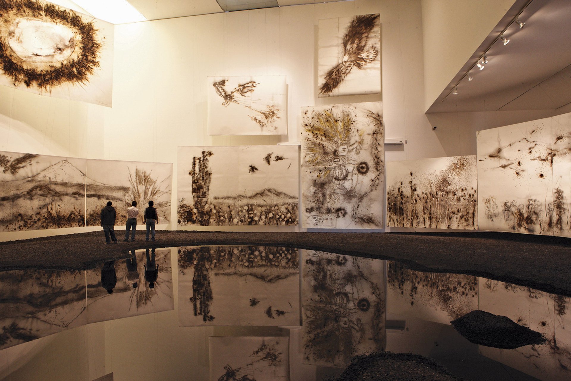Cai, an energetic international traveller who is based in New York, is perhaps best known for his gunpowder drawings. The artist sketches on high-quality Japanese paper placed on the floor, often also laying down stencils he has cut out from cardboard. Sometimes he adds foliage or garments like abayas (for Memories (2011), presented in Doha, Qatar) to the mix. Then he sprinkles gunpowder carefully around the lines, covers the ensemble with sheets of cardboard weighed down with bricks or rocks to control the force of the explosion, and lights the fuse. As onlookers watch tremulously, a blast ensues, and once assistants have stamped out embers and the smoke has cleared, the singed residue of the “drawing” is visible.