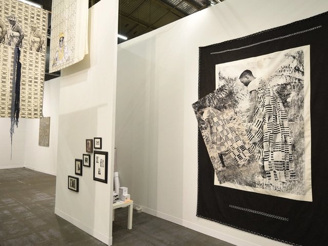 "We were surprised as it's a quite a simple hang," says blank projects' owner Jonathan Garnham of the stand's three small-to-medium-sized paintings by Samson and one hanging textile wall piece by Adams, who recently won South Africa's Standard Bank Young Artist Award. "There is kind of a conversation happening between the two artists," Garnham adds. "Igshaan saw Cinga's paintings and I think was responding to them to a degree". Both artists, in unconventional and quiet ways, celebrate the new possibilities afforded black men of their post-apartheid generation, the so-called born-frees.