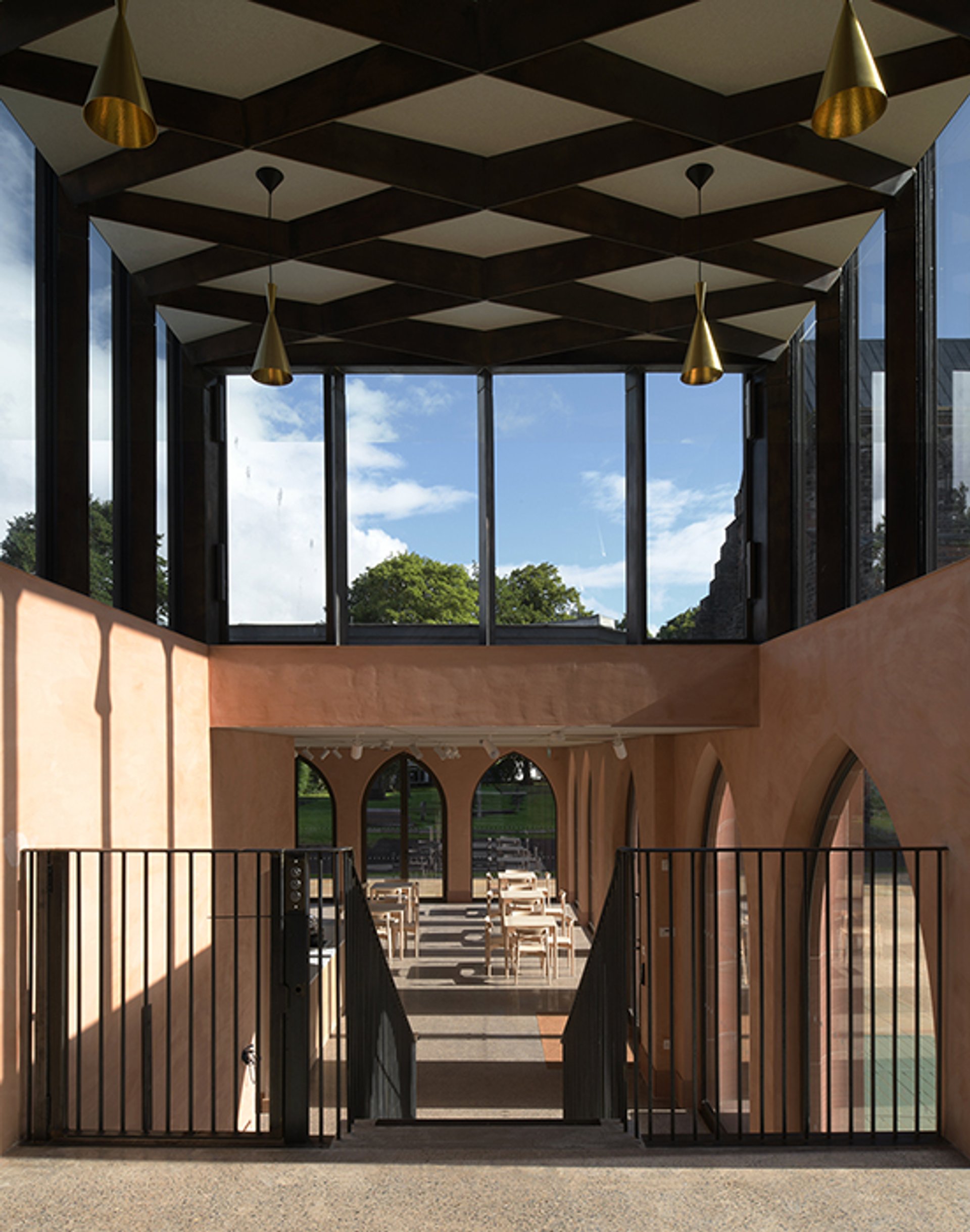 But now the Fratry is once again accessible from the main cathedral. This has been achieved through a £3.5m project by the architects Feilden Fowles—half-financed by the Lottery Heritage Fund—which has built a neighbouring sandstone cafe with a small glass and bronze link to stairs up to the Fratry hall and down to the undercroft, both also accessed by a glass lift.