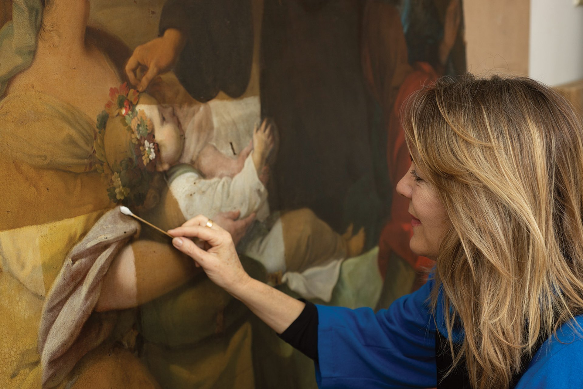 Elizabeth Wicks performs a cleaning test on Ferroni’s painting—the organisation’s final project Courtesy of Advancing Women Artists