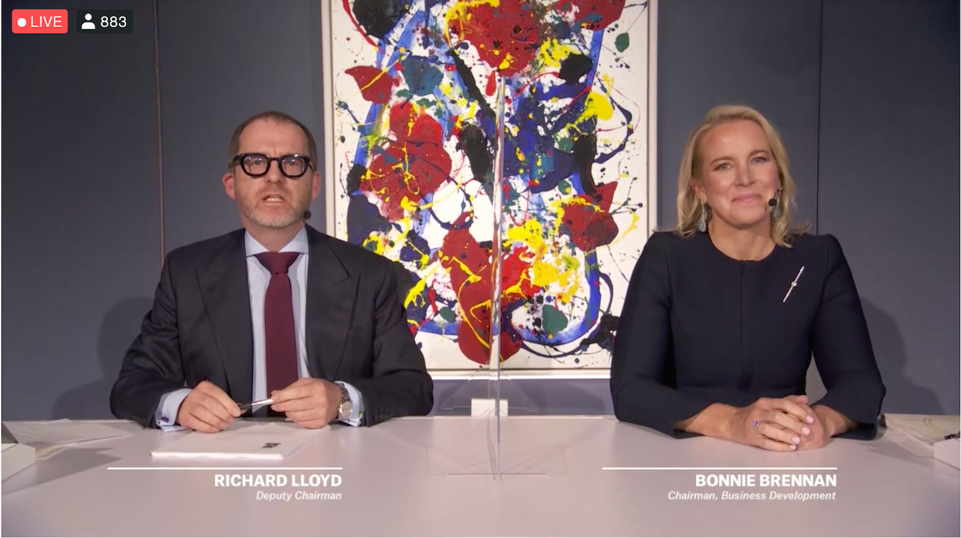 The sale was further game-ified with two hosts, Richard Lloyd and Bonnie Brennan, who were seated side-by-side (but separated by Plexiglass for safety) and offered commentary during bids throughout the evening. Particularly important lots were introduced with a cutaway video shot of the work and a digital text-and-graphic overlay that diagrammed its medium and dimensions, all set to an ambient yet urgent music track. When bidding became tense, a maudlin strings motif set to the subtle thrum of a heartbeat crept in as Meyer pressed for a price. And, taking a page out of Sotheby’s book, specialists were treated to full makeup to get them camera-ready, and many were draped with gems that will be featured in the auction house’s upcoming jewellery sale.