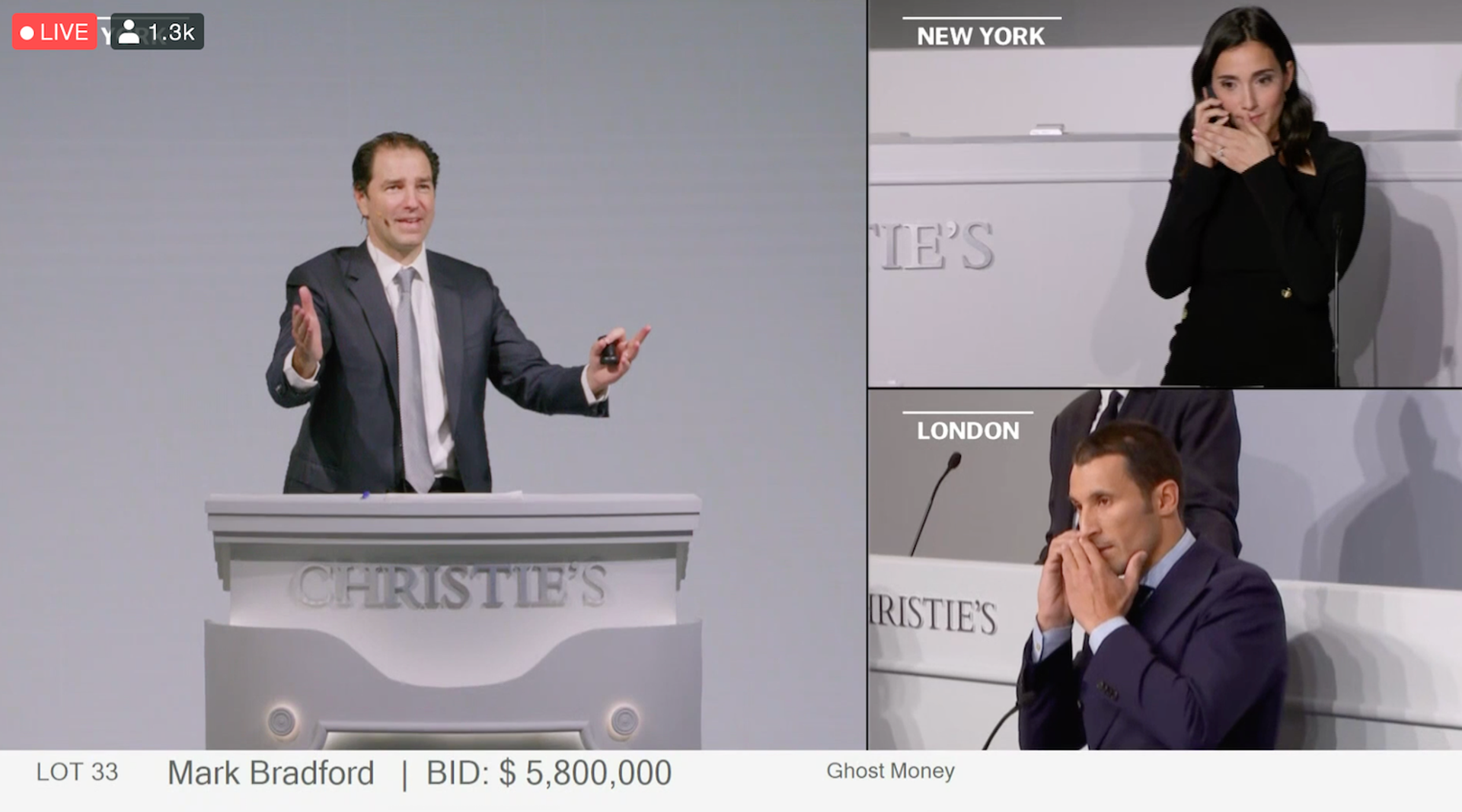 Of course, Christie’s did make every effort to make this sale an experience. With just one auctioneer, Adrien Meyer, based in New York, roughly half of the works on offer were sold to bidders on the phones with US-based specialists, despite the fact staff in the London and Hong Kong sale rooms were livestreamed in to bid on behalf of Asian and European clients. It was a seemingly needless but technically impressive holdover from the One relay sale format, perhaps, which saw four auctioneers working in tandem across sale rooms in Paris, London, New York and Hong Kong.