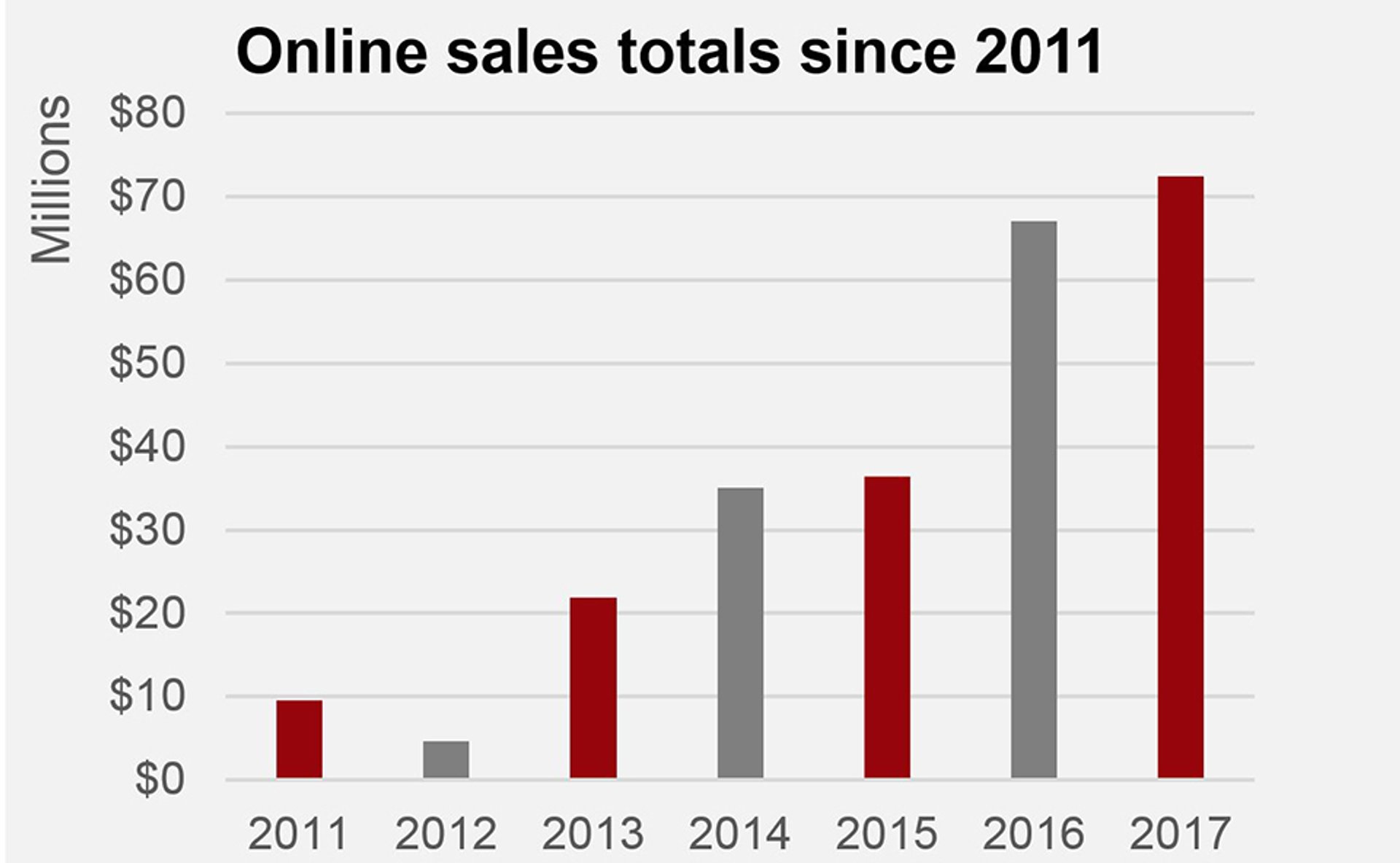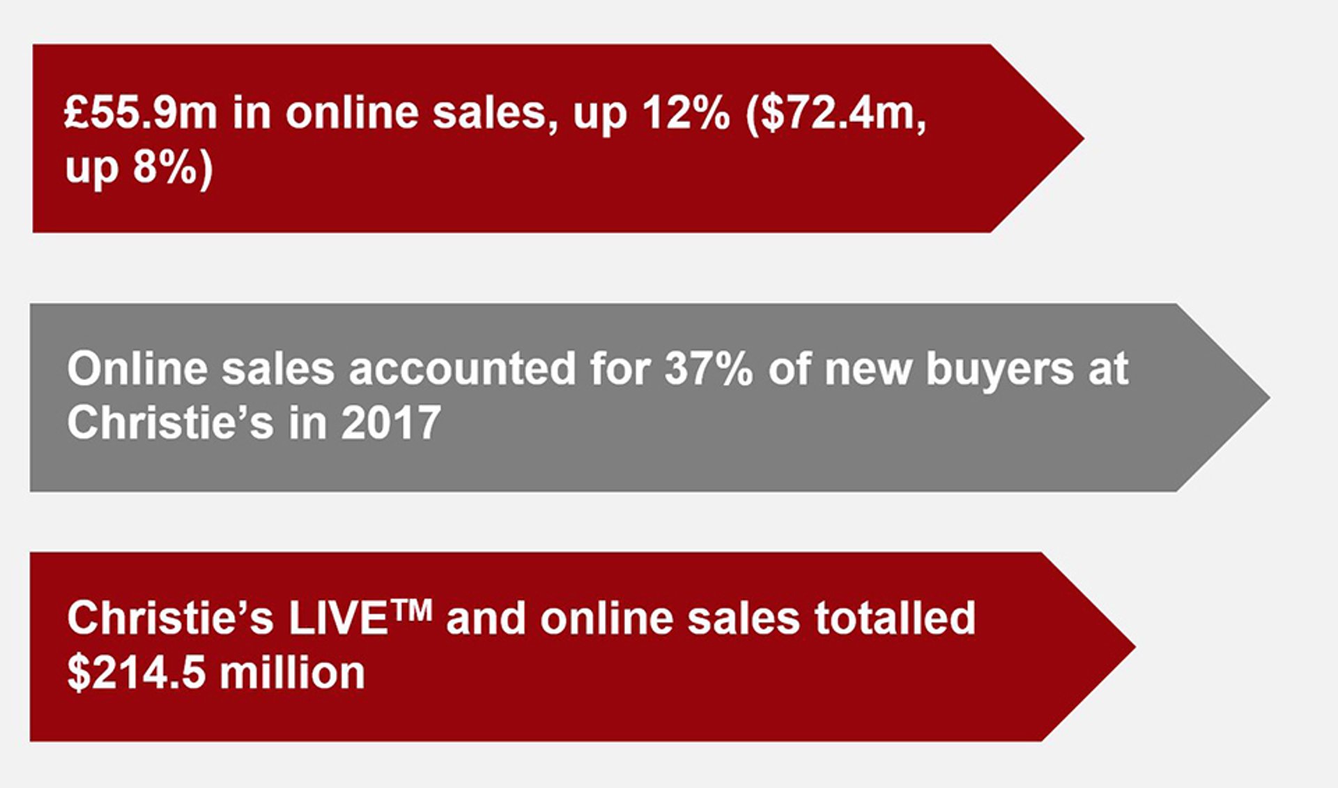 After a dip in 2016, Christie’s says its total global sales increased by 26% to £5.1bn (or $6.6bn, a 21% increase in US dollars) in 2017, helped in large part by the $450.3m Salvator Mundi by Leonardo da Vinci sold by the auction house in November. The bulk, predictably, came from auction sales, which contributed £4.6bn ($5.9bn), up 38% on 2016, with a 81% sell-through rate, while online sales added £55.9m, up 12% ($72.4m). However, private sales were down by 32%, at £472.4m ($611.8m).