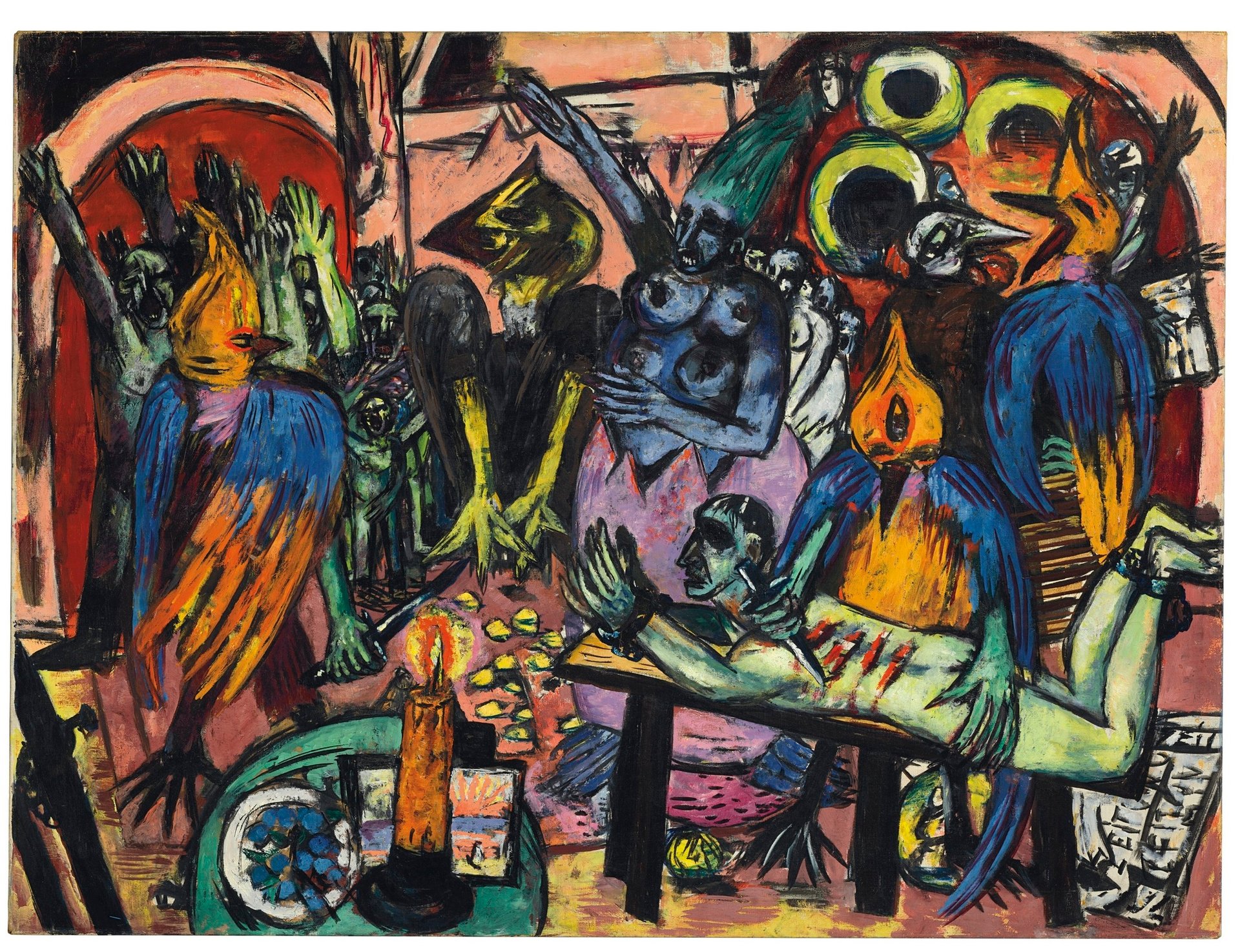 As anticipated, the star of the night was Max Beckmann’s Hölle der Vögel (Birds’ Hell) (1938), estimated at a guaranteed £30m, which the dealer Larry Gagosian won, phone to ear, for £32m (£36m with fees)—a record for Beckmann and for any German Expressionist work. The luridly hued work, depicting a visceral scene of hellish torture, which Beckmann painted in exile in Amsterdam and Paris, is not commercial, but it is powerful.