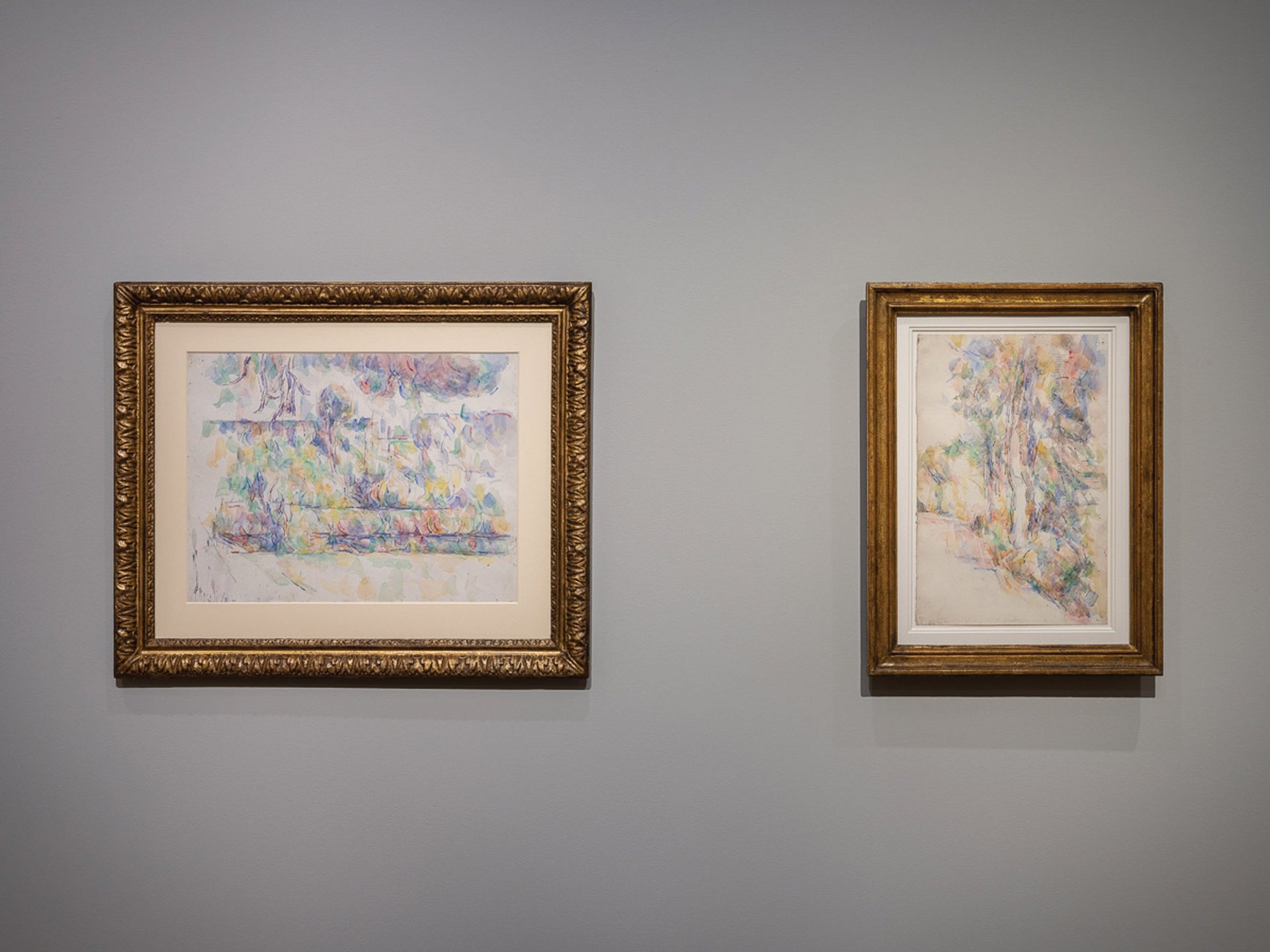 A new exhibition of Cézanne's works on paper at Luxembourg & Dayan in London draws on numerous loans and forensic analysis. Pictured (left) Le Jardin des Lauves: vue sur Aix et la Cathédrale de Saint-Sauveur (1902–06) (right) Route avec arbres sur une pente, (c. 1904.) Fondation Beyeler, Riehen/Basel. Photo: Damian Griffiths