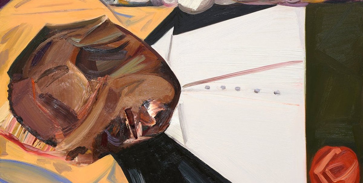 Till was a 14-year-old boy from Chicago who was visiting family in Mississippi. After a white woman accused him of flirting with her—a story she recanted decades later—was kidnapped by the woman’s husband and another man, beaten and shot. When his body was recovered and returned to his mother in Chicago, she insisted on an open casket funeral, saying: “Let the people see what I’ve seen.” A photograph of Till’s disfigured face was published in The Chicago Defender and Jet magazine, and became a rallying point for the Civil Rights Movement. Schutz’s painting takes this photograph as its inspiration, but does not exactly recreate it.