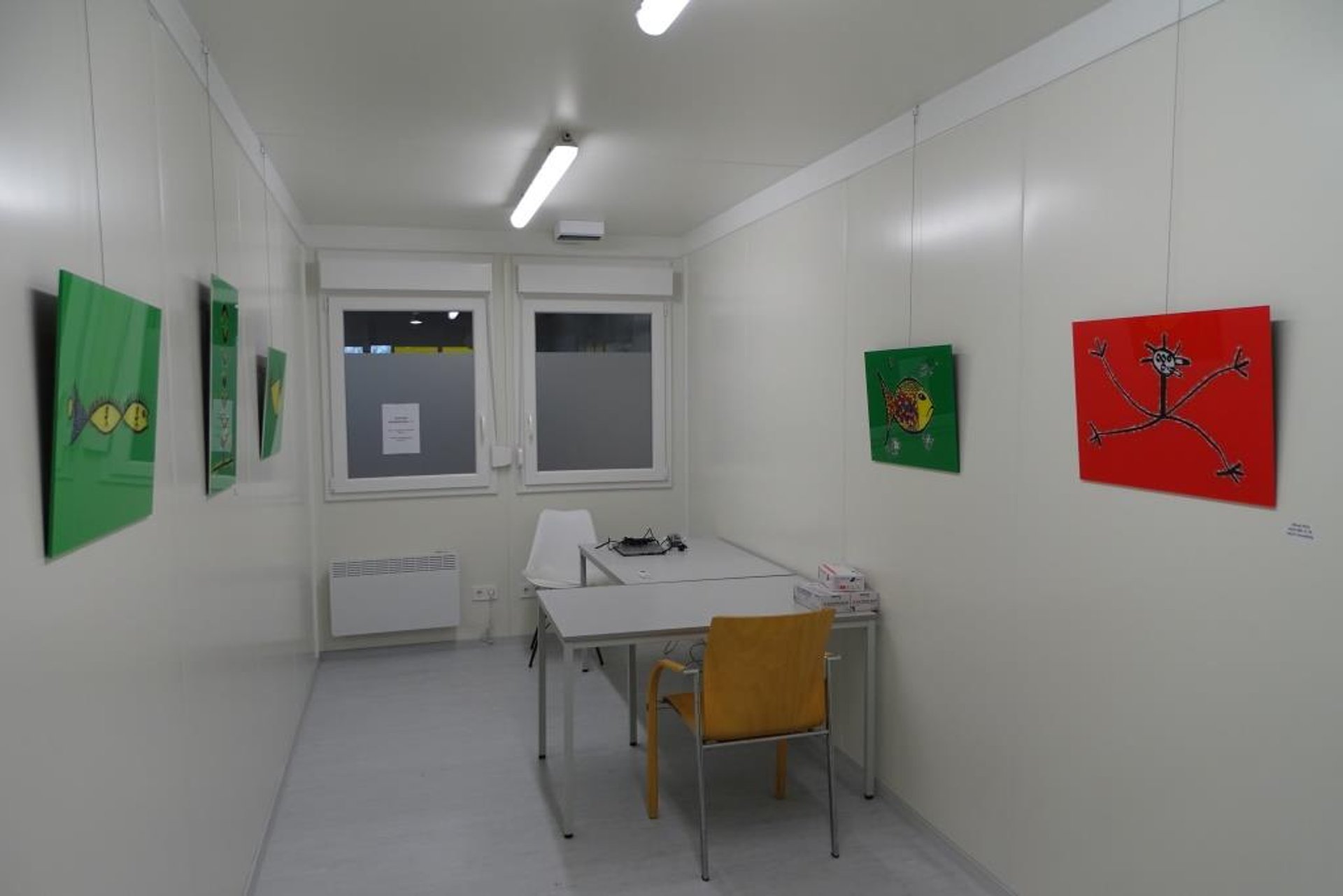 Paintings are hung on makeshift grey curtains used to divide space in the temporary vaccination centre and on the walls of the containers where injections take place. Security guards protecting the vaccine ensure that the art is also safe, Gruber says. The art in the waiting area has proven a welcome distraction for some patients, he says, even if not all are interested in art.