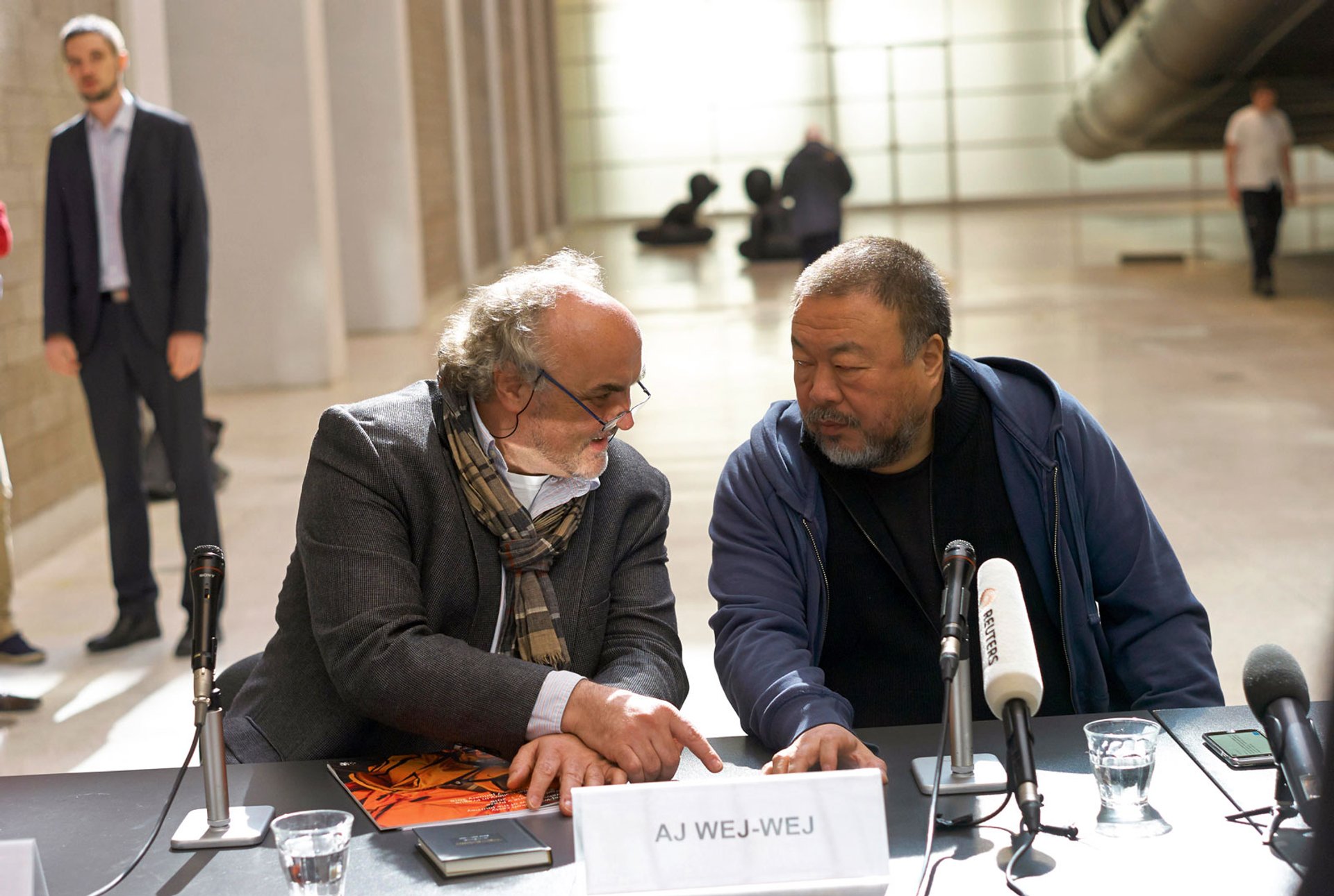 Czech Culture Minister Antonin Stanek will step down after protests over his dismissal of Jiri Fajt (left), who ruffled feathers with exhibitions, including Ai Weiwei’s (right) 2017 show, which featured an inflatable refugee boat © dpa picture alliance / Alamy Stock Photo