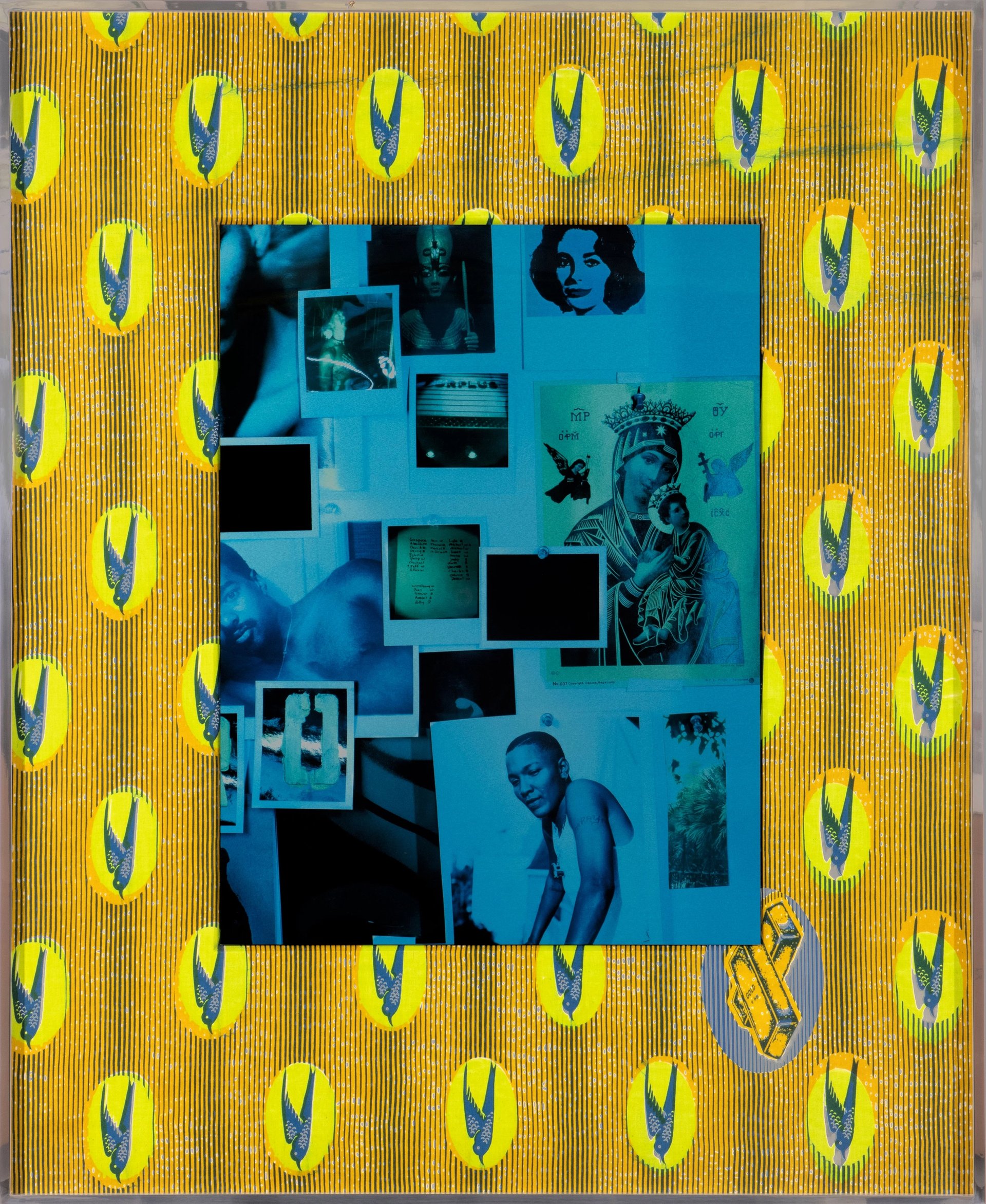 Lyle Ashton Harris, Intercession #1 (detail) (2020), unique assemblage (dye sublimation photographic print on aluminum and Ghanaian fabric) Courtesy David Castillo