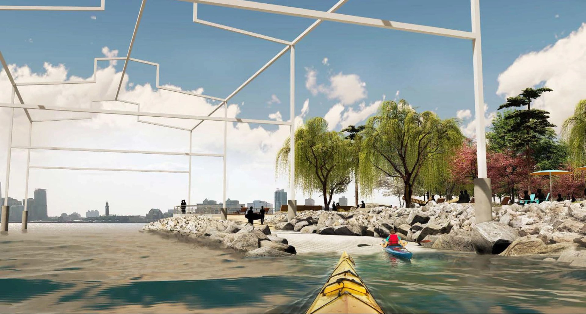 The project by the New York landscape architects James Corner Field Operations includes a small sandy beach, tide pools and a kayak launch located directly below Hammons’s skeletal steel structure. The landscape design was inspired by Hammons’s installation and its reference to Matta-Clark’s Days End, the firm notes in their concept proposal. “Matta-Clark cut an existing warehouse in three places to create ‘a temple for sun and light’ and transform an utilitarian structure into an almost spiritual experience,” the document states. “While Hammons’s piece does not replicate the three cuts, we are loosely evoking them. We are cutting into landscape to create connections to water and into the canopy [above nearby public convenience buildings] to shape light and shadow.”