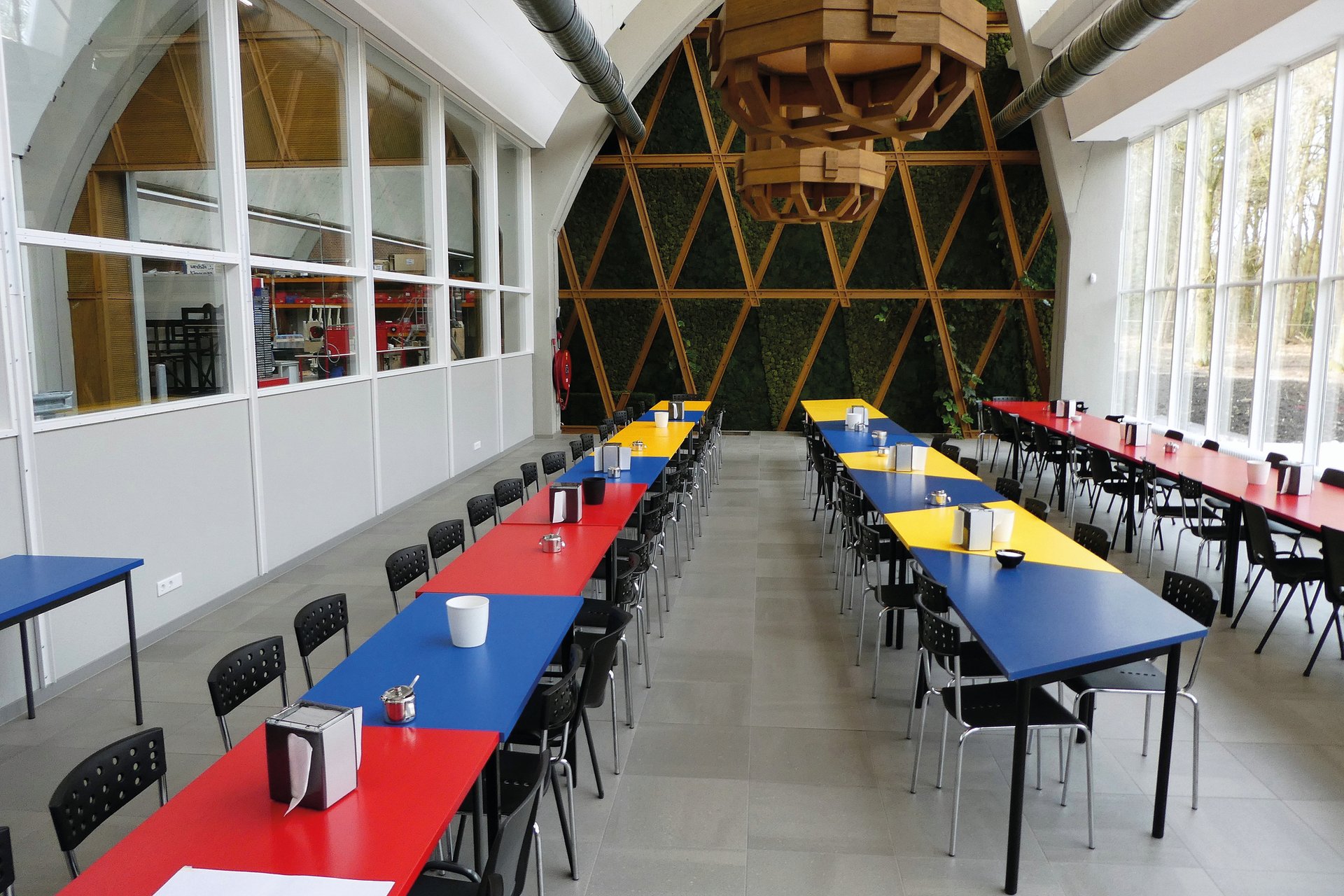 The restoration of De Ploeg was entrusted to the Eindhoven- and Rotterdam-based architectural firm Diederendirrix and the Dutch designer Aart van Asseldonk. Their challenge was to modernise the building without changing its original, sharp aesthetic. “Our aim was to find solutions without losing the heritage [of the site],” says Rob Meurders, the head of the design team at Diederendirrix. Because De Ploeg is a state monument, Meurders and his team also had to justify the need for certain improvements. In the end, several significant improvements were made, such as removing later extensions, recladding the façade, insulating the roof and increasing natural light levels by uncovering glass roof panels that had been blocked off. The original De Stijl colour scheme was reinstated in areas across the site, including on the warehouse doors, and gardens that had been made into parking spaces are gardens once again.