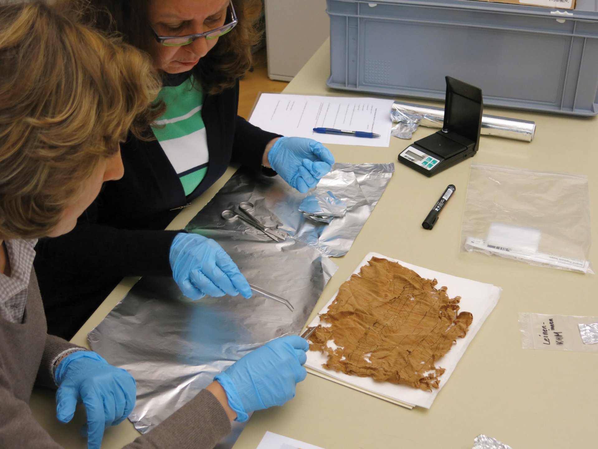 Rolled-up papyri are now a rare find. Conservators had to devise a special method to flatten the text. Because of its brittle condition, it was first treated in a humid chamber to restore the flexibility of the fibres. The papyrus was then treated with cellulose and smoothed with the aid of a suction table and weights.