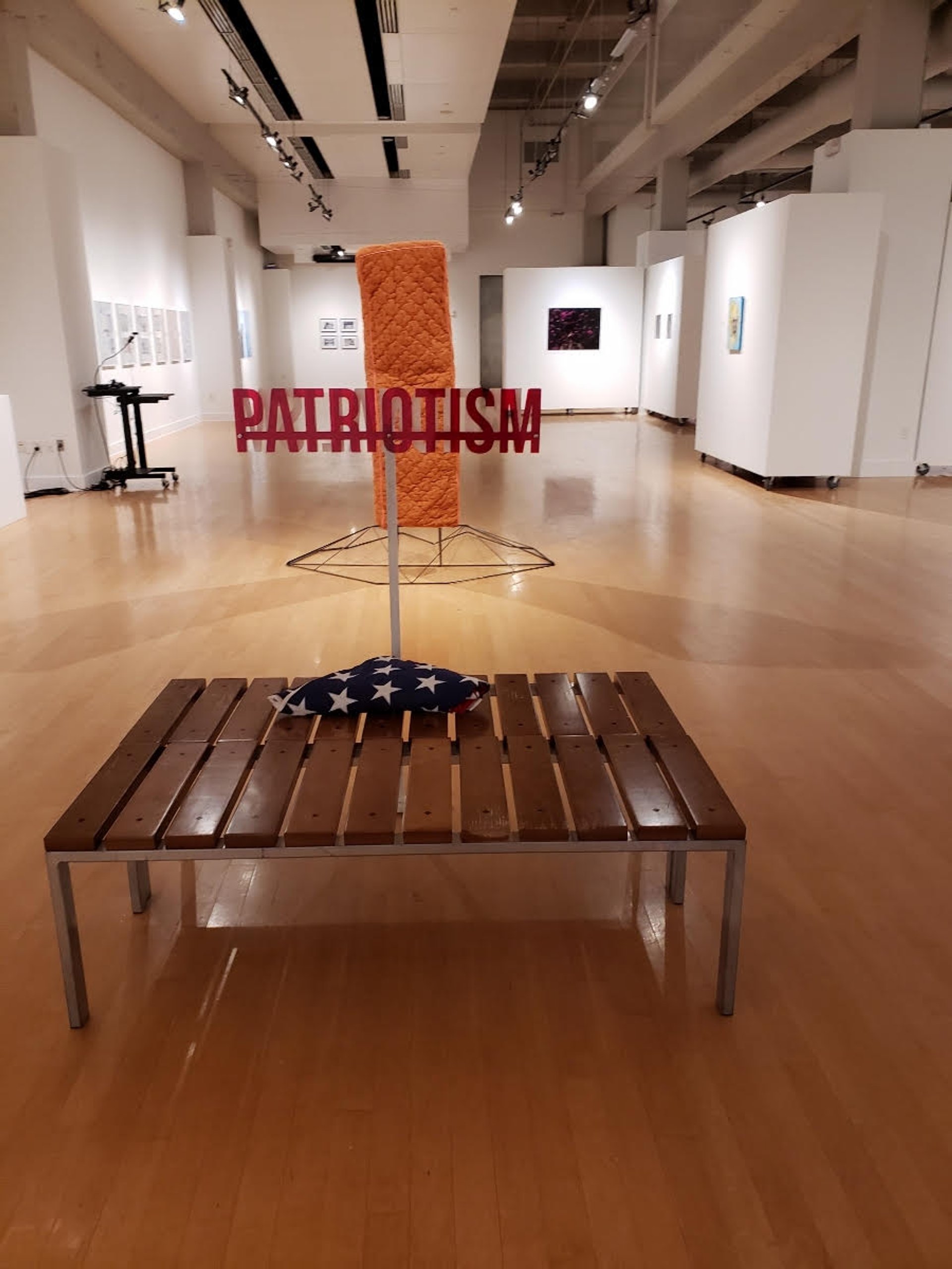 A group of students, who have not been identified, also entered the gallery days after the show opened, folded the US flag used in the work into a triangle—a military tradition—and placed it on a bench. They also turned the installation around so that visitors would first see the word “patriotism”. The students then allegedly confronted a student gallery attendant, Quintana says, demanding to know “why the university’s art department would support such a derogatory, slanderous artwork”.