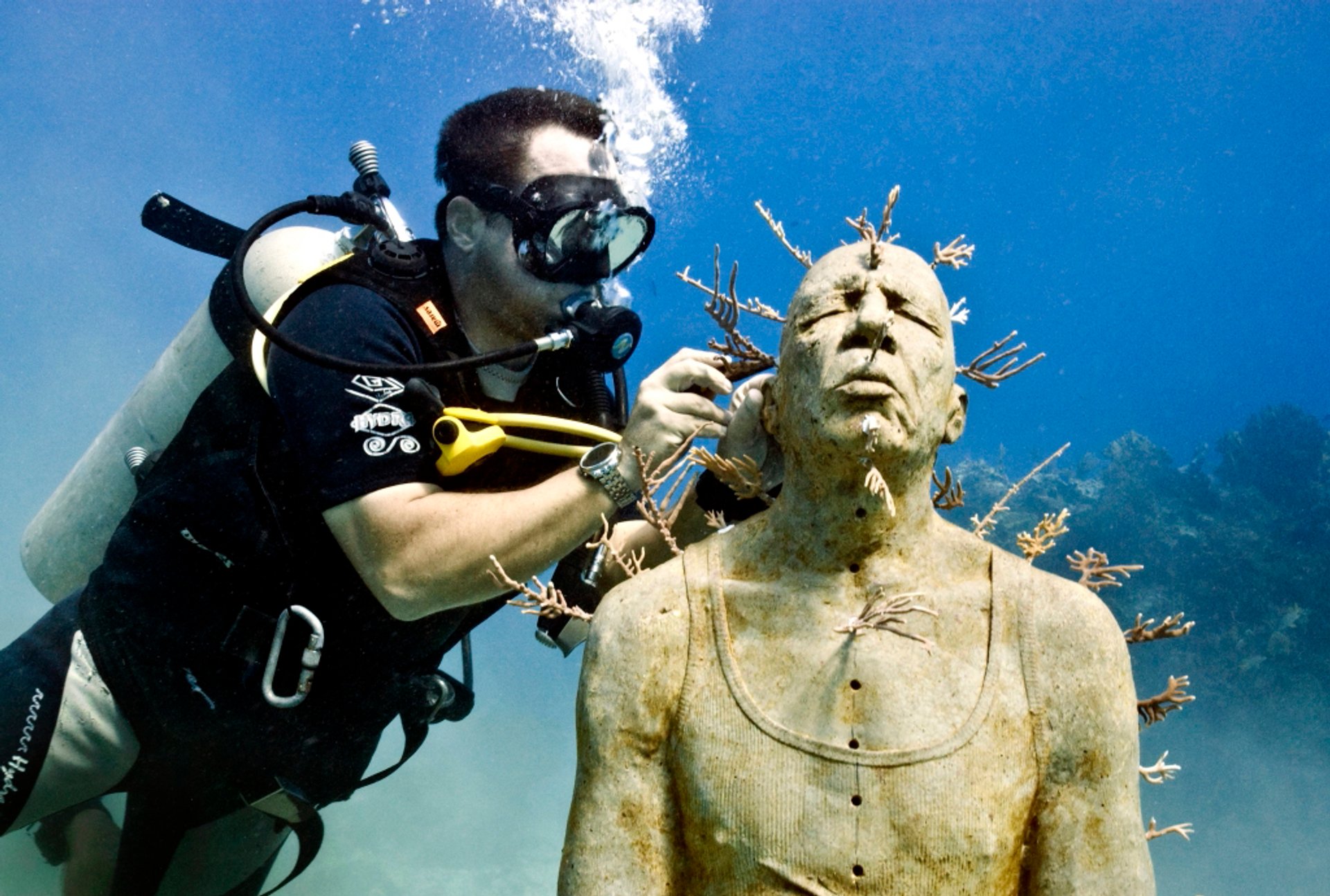 The British sculptor Jason deCaires Taylor putting the finishing touches to a work off the coast of Cancun, Mexico, in 2009