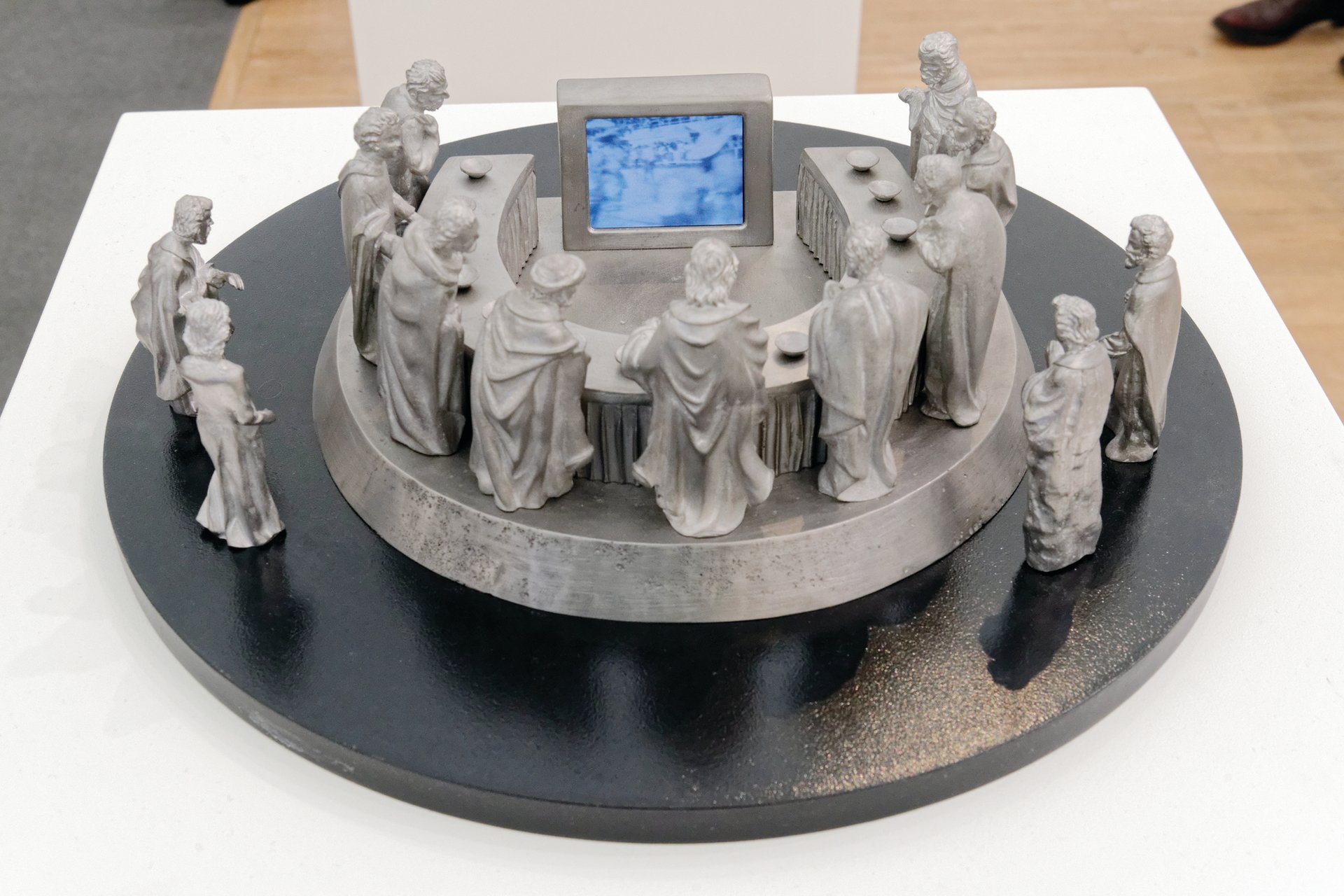 A 2007 sculpture by Christoph Schlingensief, who was an altar boy as a child, toys with typical depictions of the Last Supper: his disciples gather around a video monitor. “The ritual of Catholic Mass has been very important for Christoph in the way he works,” says Florian Berktold, a director of Hauser & Wirth (FL, D6), which is selling the sculpture in an edition of five (priced at €25,000 each).