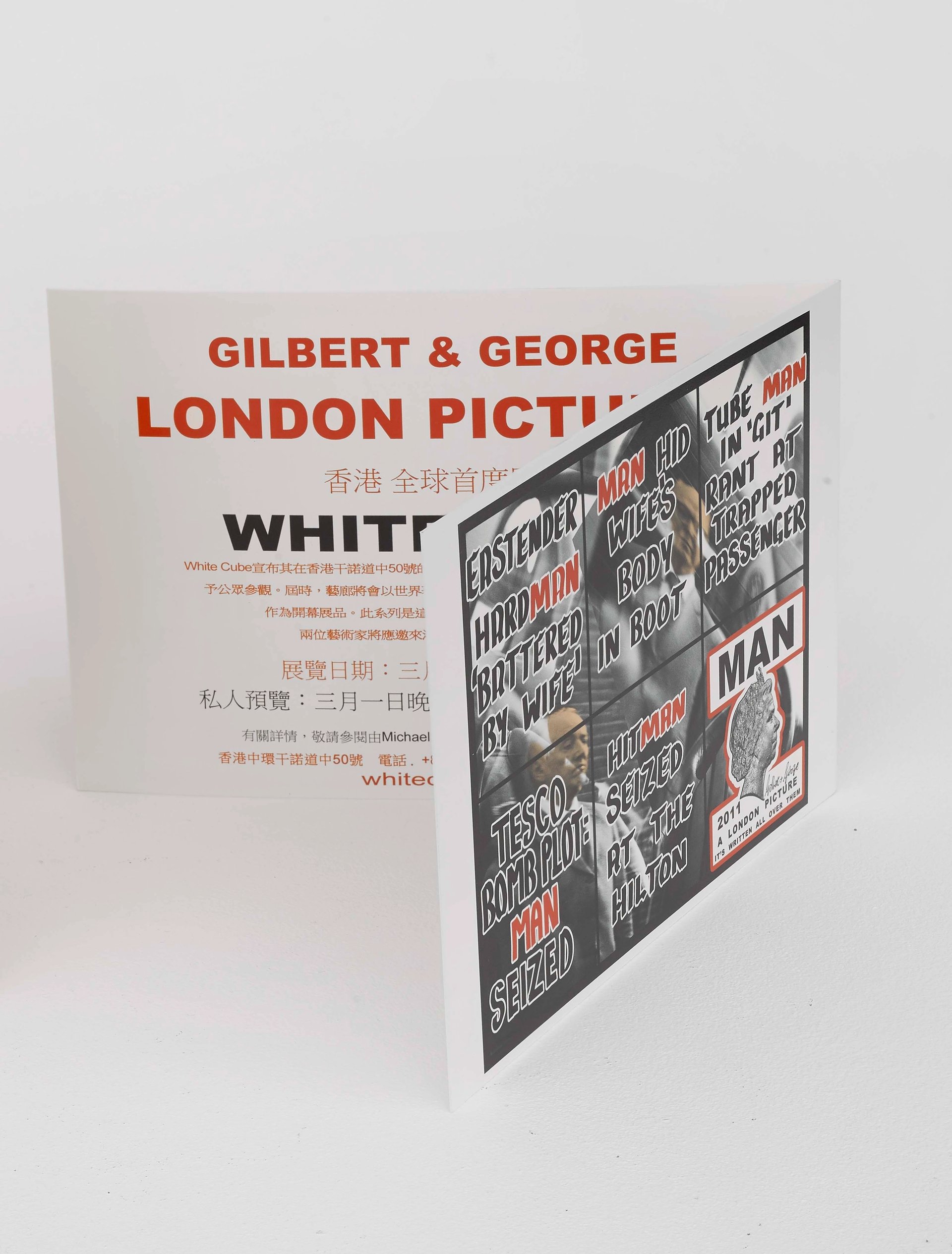 Invitation card for Gilbert & George's show London Pictures in 2012, the inaugural exhibition at White Cube Hong Kong Courtesy of White Cube