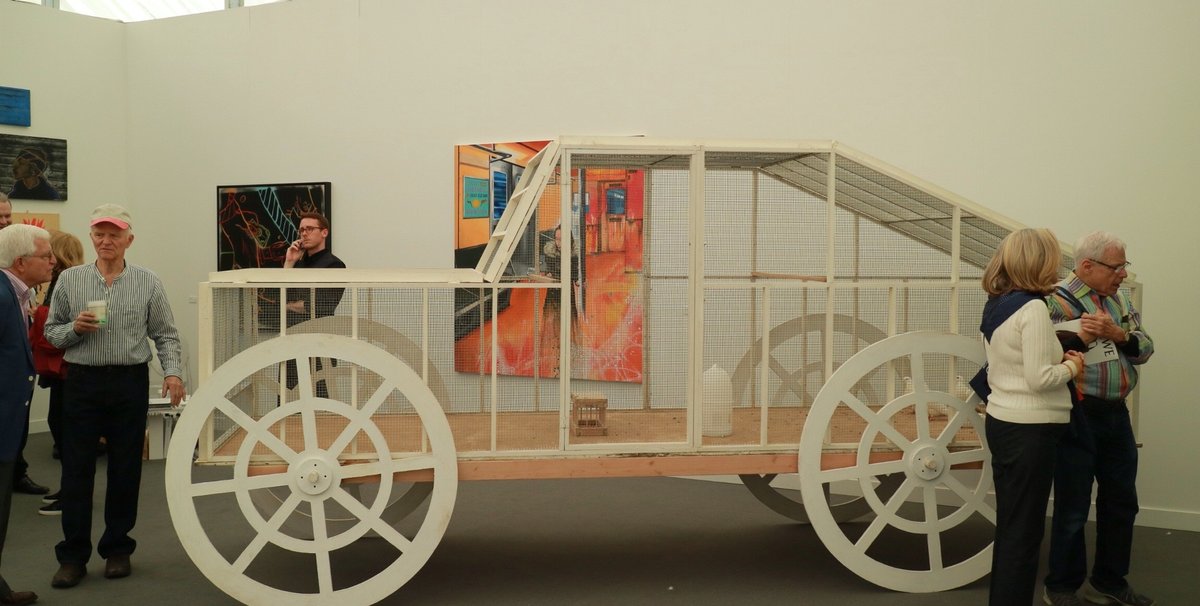 Wendy Olsoff, the cofounder of PPOW, says the inspiration for her presentation of works (both historical and contemporary) by Charlie Ahearn, Chris Daze Ellis, Anton van Dalen, David Wojnarowicz, and Martin Wong was a “disappearing New York”. All five artists were active in the East Village and Lower East Side when pioneering galleries like PPOW and Civilian Warfare began cropping up—Wojnarowicz’s triptych Peter Hujar Dreaming (1982) hung over the latter’s storefront. At Frieze, it hangs above The Pigeon Car, a coop complete with live birds in the shape of a station wagon that van Dalen built in 1987 for a show at Exit Art—both a reflection of his pigeon-keeping hobby, which brought him in touch with a melting pot of fellow immigrants, as well as a commentary on their treatment in the US. More recently, his painting Bird Walker of Chinatown (2012-13) nods to the area’s still-changing demographic with a silhouetted figure in Ugg-like boots traipsing up the street. Displayed along with paintings documenting street culture by Ahearn, Daze, Wong, the works speak to an era when art was defined by practice, not product.