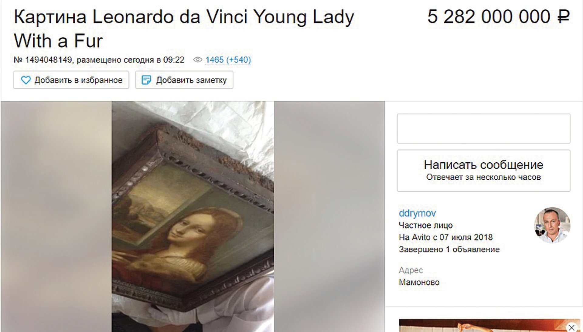 Before its removal, four days after it was posted on Avito, the advert read: “Attention: I am selling the original Leonardo da Vinci painting ‘A Girl in Furs’. Location: Germany... estimated value €280m... asking price €72m.”