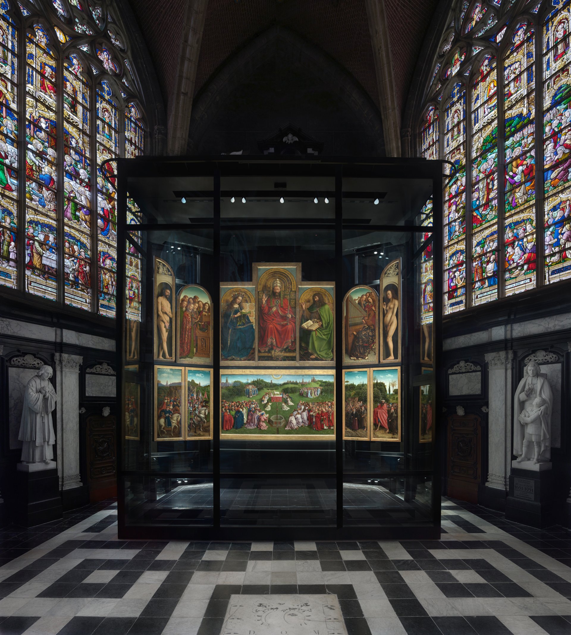 The altarpiece had been moved several times in the cathedral over the centuries, and will now be seen in one of the largest chapels, close to its original site. After years of conservation work, which revealed many lost details and the glowing colour of the original paint surface, it is now displayed in a six-metre tall climate controlled glass case. The huge case allows the wings of the 12-panel altarpiece to be opened automatically each morning and closed again in the evening, and for visitors to see both the jewel-like fronts of the 12 panels, and the more muted paintings on their reverse of Old Testament figures and the 15th-century donors who commissioned it. The case will protect the panels from direct sunlight, and from erratic temperatures in the building which can fall as low as 2c in winter, and incorporates a backup passive system in case of a power failure.