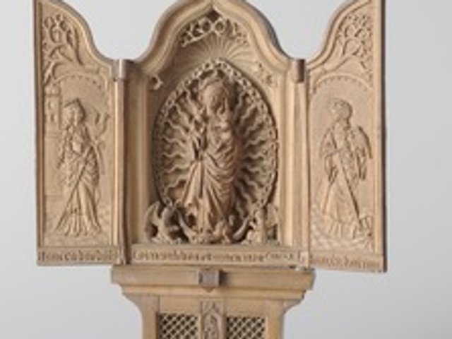 Expertly carved from boxwood, these micro-carvings, some of which are just 25mm in diameter, take the form of prayer beads (also known as prayer nuts), altarpieces, shrines, skulls and coffins. Religious scenes decorate these microsculptures, which were used as devotional or contemplative objects. The scenes are often wonderfully complex, allowing the owner to discover something new each time they looked at the object. Frits Scholten, the curator of Small Wonders, says the act of looking at and trying to identify the biblical stories depicted in these miniature sculptures is like a small pilgrimage in itself. "It's a pilgrimage of the eye." His aim is to show the breadth and virtuosity that went into the creation of these works and stress their playfulness.
