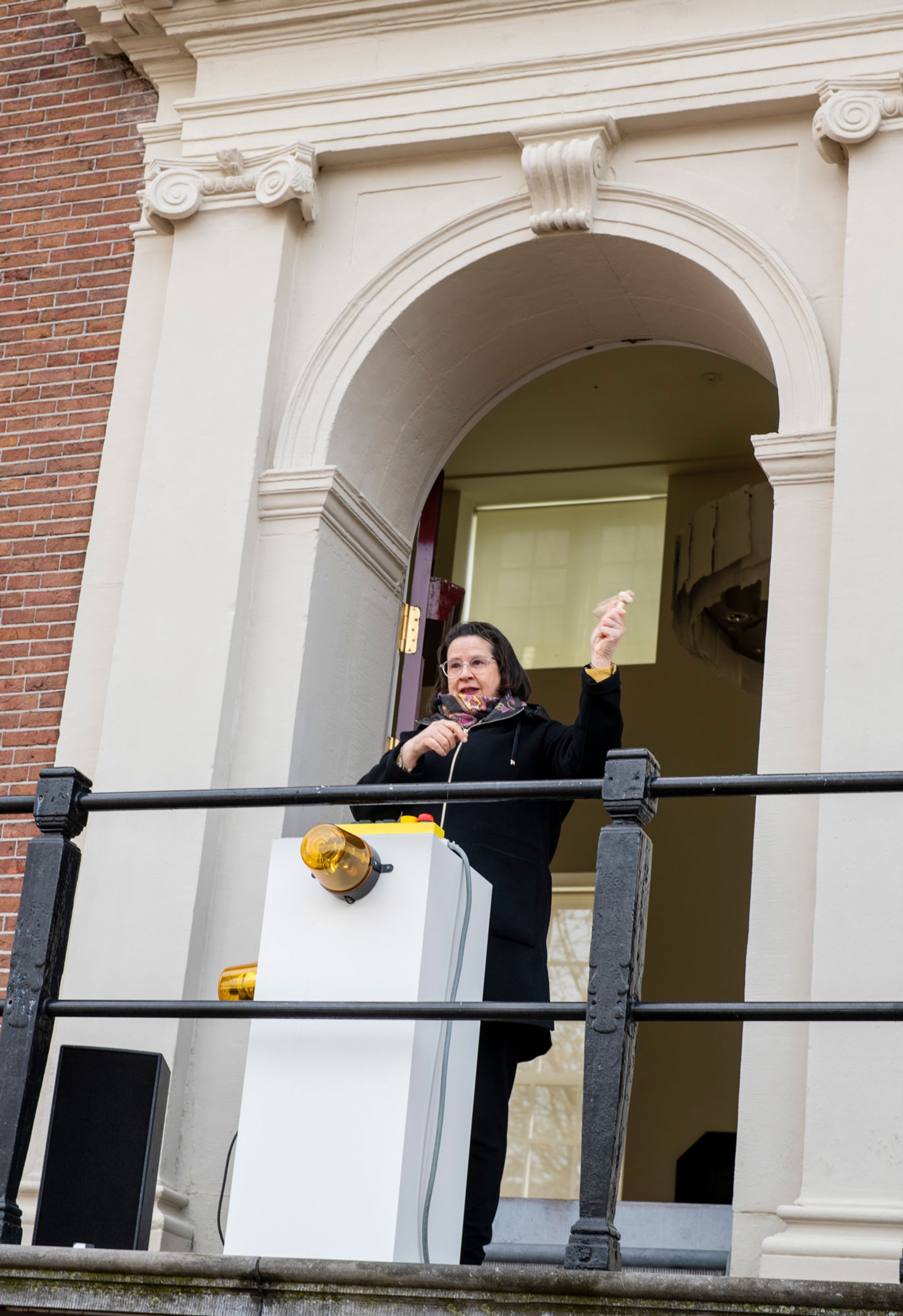 Annabelle Birnie, the director of the Hermitage Amsterdam since January, sounded an alarm outside the museum on 6 April to kickstart the emergency crowdfunding appeal Photo: courtesy of the Hermitage Amsterdam