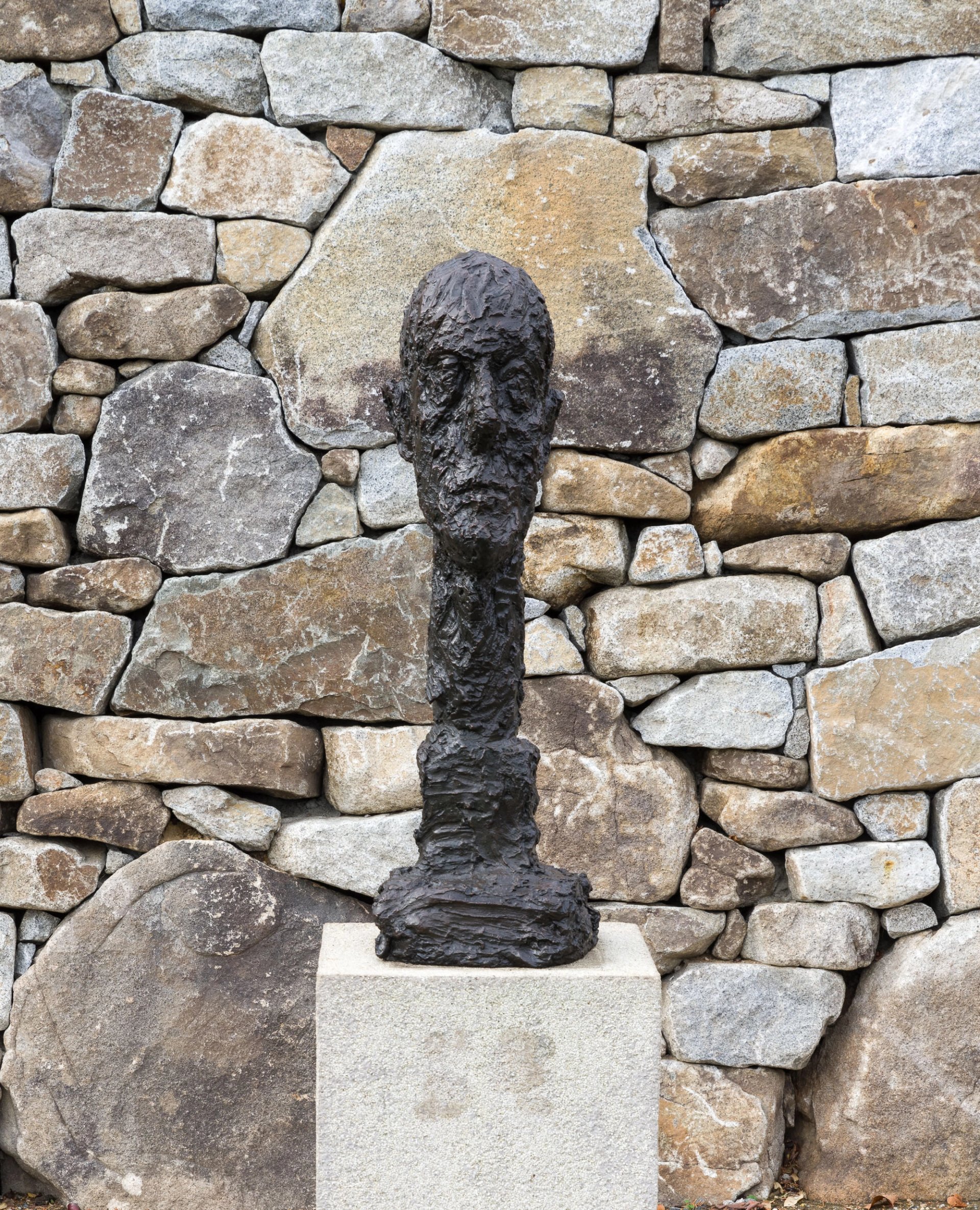 A mockup of the kind of stacked stone walls that Hiroshi Sugmioto is proposing for the Hirshhorn's sculpture garden, with Alberto Giacometti's Monumental Head (1960). Hirshhorn Museum and Sculpture Garden, Smithsonian Institution