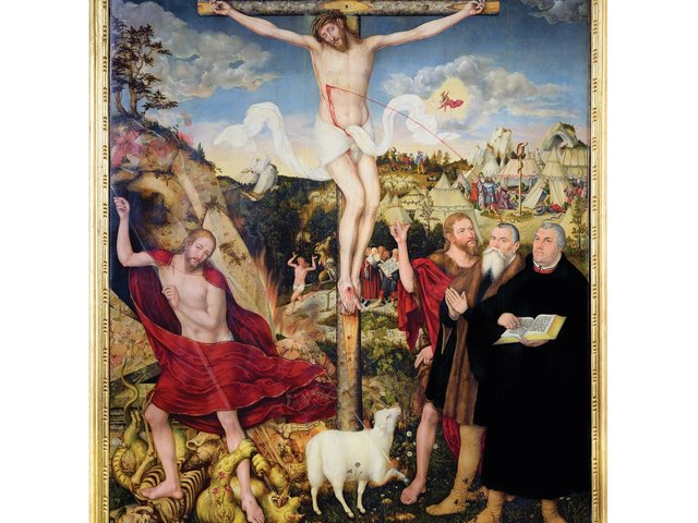 Originally thought to be the work of the elder Cranach finished off by his son, it is now recognised as the work of the son alone. It manages to encapsulate the entire programme of the Cranach workshop since its inception. The panels to the left and right depict Frederick the Wise, his family and successors. In the centre the figure of Christ on the Cross, the centre of a typical Gesetz und Gnade (law and grace) picture—with the condemnation of Catholic sinners on the left and the glorification of the virtuous Protestants on the right. The figures on the right are perhaps surprising but obviously important to the Cranachs: first St. John the Baptist, then Cranach the Elder, then Luther showing his printed Bible to the viewer. Any doubt about who was most important is dispelled by the stream of blood that flows from Christ’s side and lands on Cranach the Elder’s head.