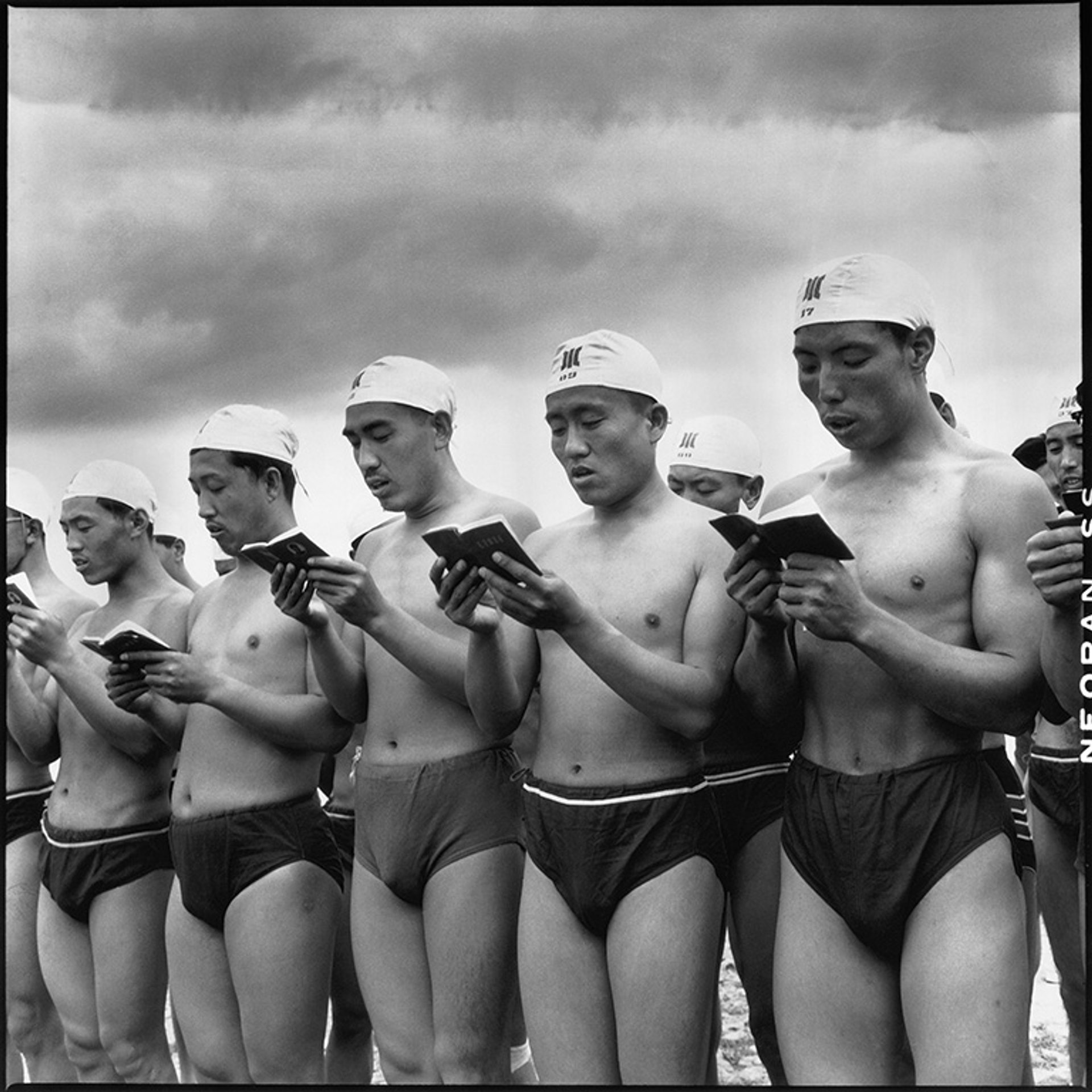 Swimmers read quotations from Chairman Mao for spiritual guidance as they prepare to swim the Songhua River, 1968 Credit: Li Zhensheng/Contact Press Images