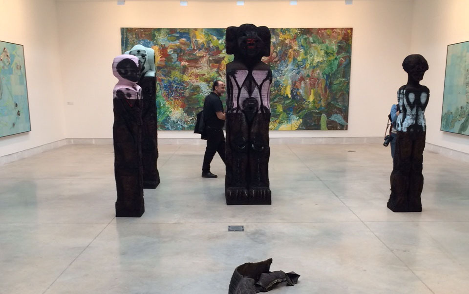 So there are some superstar white male artists in the show (Andreas Gursky, Hans Haacke, for example) but they are few and far between. Enwezor is clearly using his platform to draw the attention of the biennale crowd away from art market darlings (Oscar Murillo makes a surprise appearance) to lesser-known artists, from Africa, Asia and Latin America or their diaspora. A key room in the exhibitions places paintings by the Irish African American artist Ellen Gallagher, with a twisted, burned out tyre sculpture, Atlas (2015), and wooden totemic figures by the Pakistan-born Huma Bhabha. A large painting by the late Australian Aboriginal Emily Kame Kngwarreye, Earth’s Creation (1994) completes the presentation.
