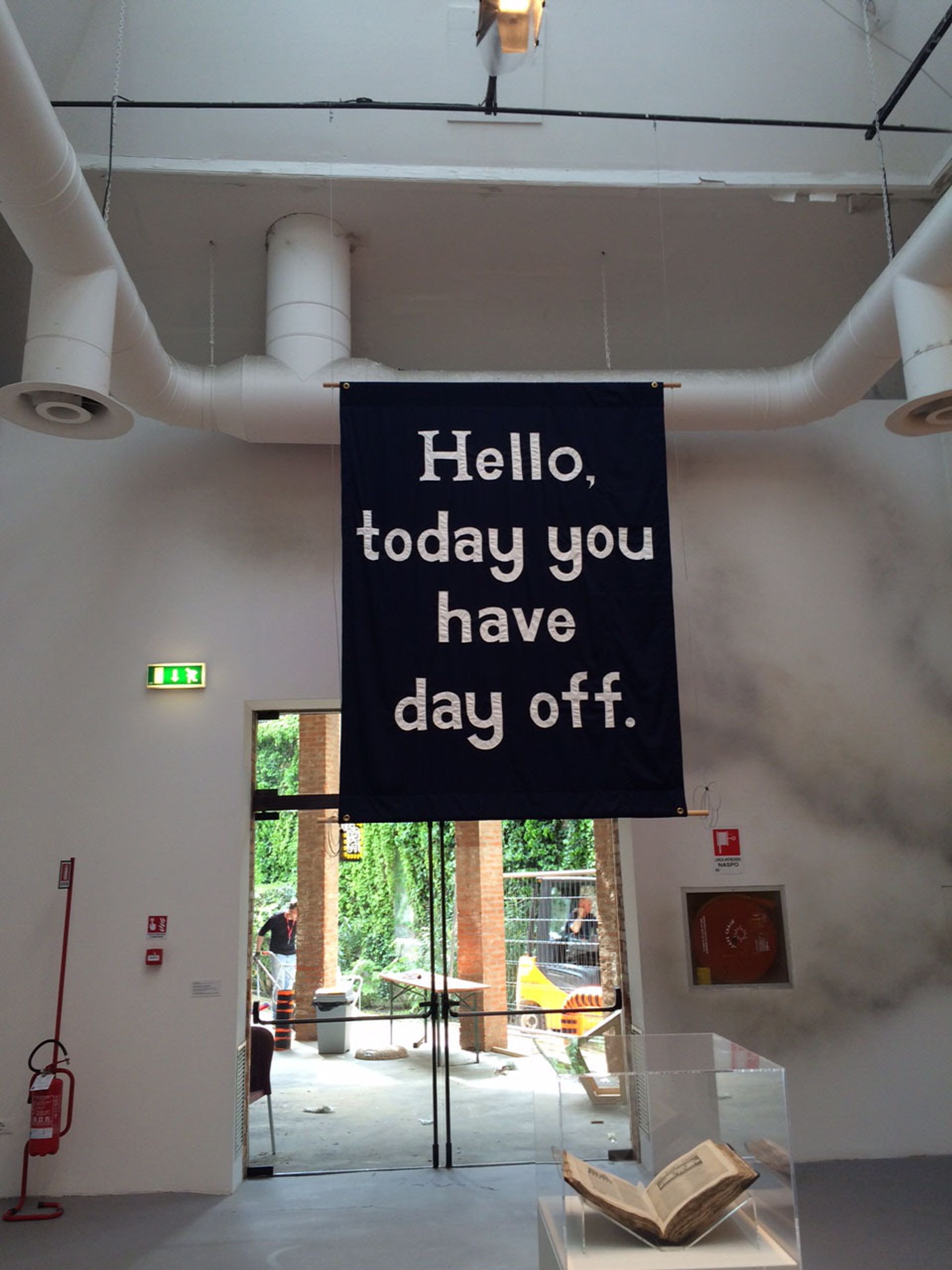 Workers as units of production Jeremy Deller, Hello, Today you have a day off, 2013