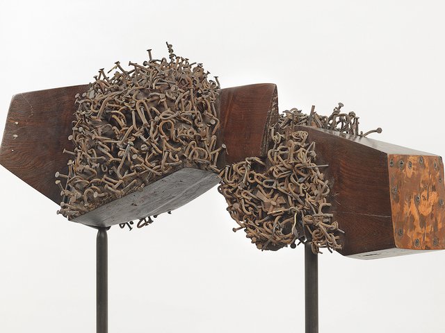 The final room of the show contains large paintings that memorialise figures from the poet Maya Angelou to the boxer Muhammad Ali. Whitten, who was born in Alabama in 1939, met Martin Luther King Jr and lived through the Civil Rights Movement. He also created the sculpture Homage to Malcolm (1965) from a single piece of elm about half a year after the activist was assassinated. Here, the catalogue notes, Whitten first used three elements that would become a trademark: embedded nails, painted horns and an asymmetric, decentralised composition. As well as remembering the slain Civil Rights leader, the work alludes to the protective aspects of Central African religious sculpture, the catalogue adds.