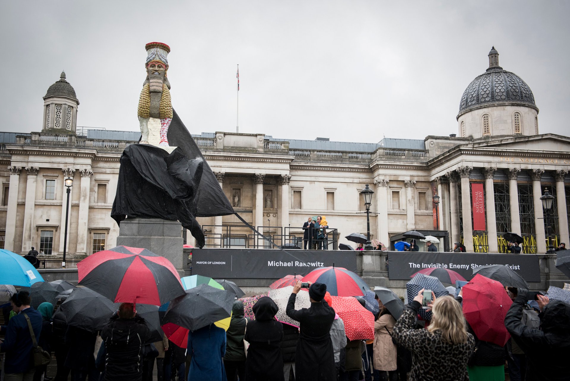 “The salvage of date syrup cans in this work makes present the human, economic and ecological disasters caused by the Iraq wars and their aftermath,” he said in a speech just before the sculpture was unveiled. “The reconstruction of the lamassu set on the Fourth Plinth allows an apparition to haunt Trafalgar Square at a time when we are witnessing a massive migration of people fleeing Iraq and Syria. I see this work as a ghost of the original and as a placeholder for those human lives that cannot be reconstructed, that are still searching for sanctuary.”