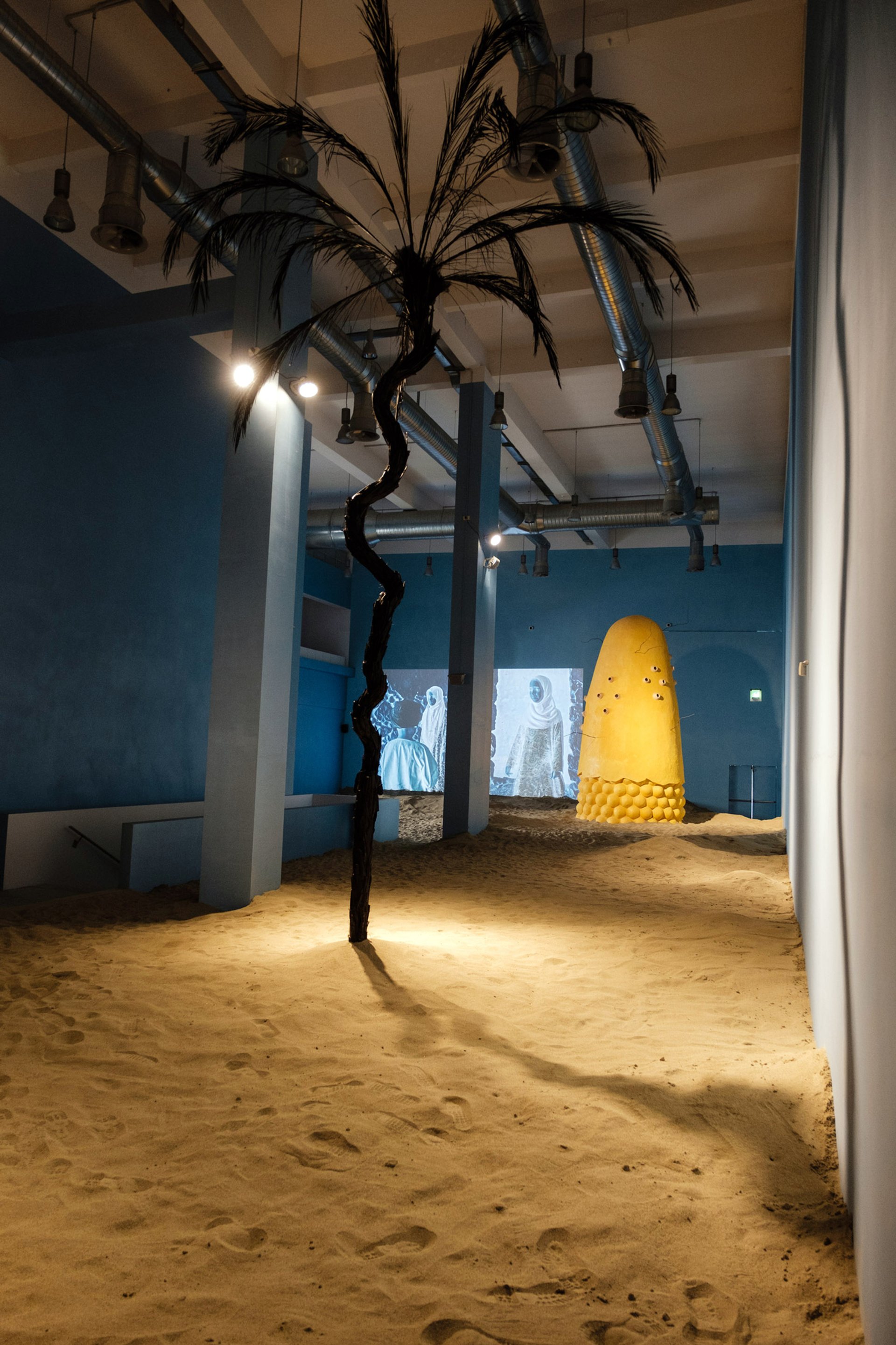 Shawky’s show at the Fondazione Merz is his prize for winning the first edition of the Mario Merz Prize. The space has been transformed into a blue-hued desert landscape, replete with sand dunes and palm trees, in which another trilogy of films, Al Araba Al Madfuna (2016), is shown together for the first time. The culmination of a lengthy visit to a village near the ancient Egyptian capital of Abydos, the films conflate history with archaeology, myth and story-telling, all in Shawky’s signature cinematographic style. “It’s interesting that these works are being shown during this period of so–called ‘clashes of civilisations,’” Christov-Bakargiev says.