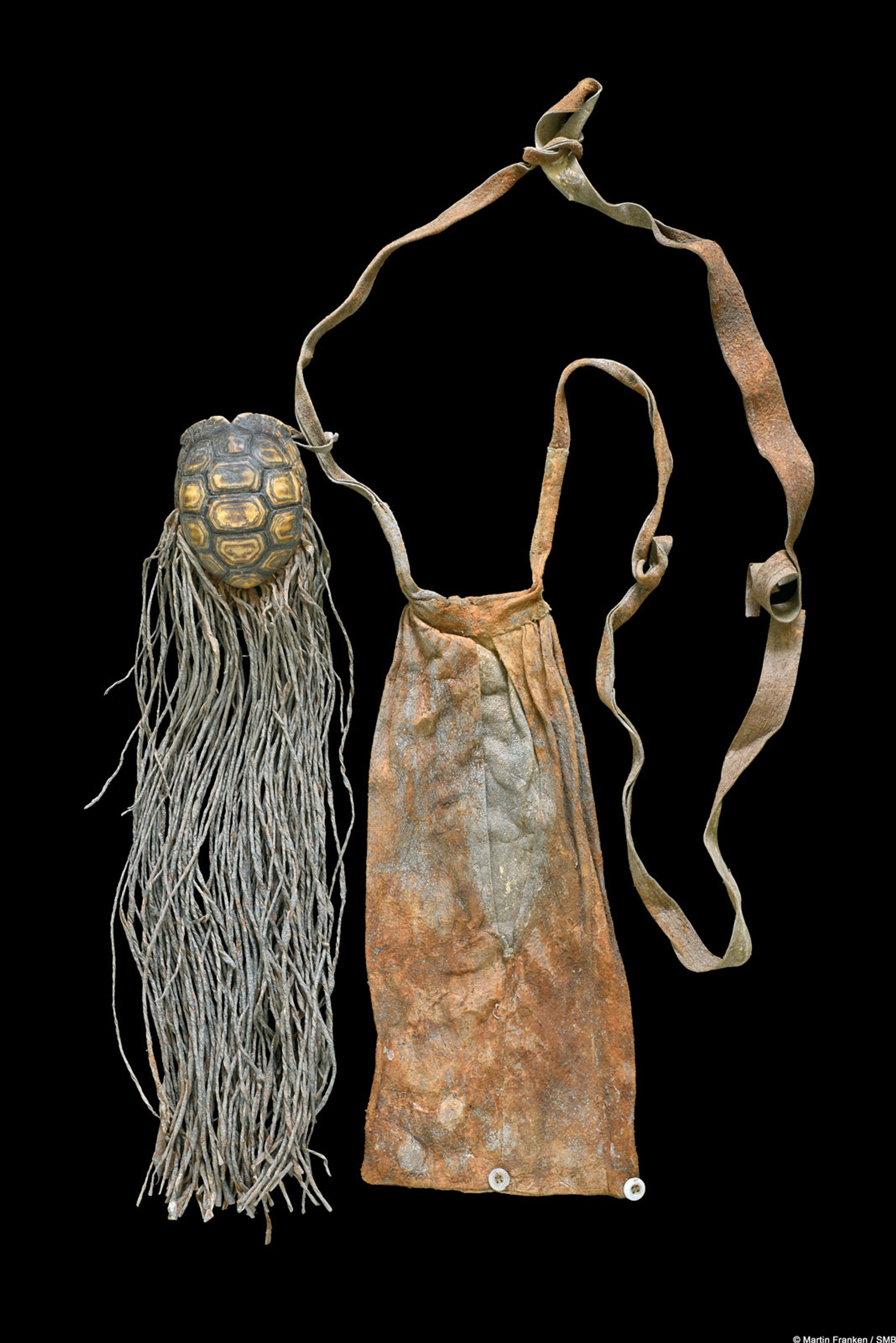 Turtle shell with leather bag (known as ! Uros), # Nu-Khoen people (around 1875) © Ethnologisches Museum, Staatliche Museen zu Berlin – Preußischer Kulturbesitz / Martin Franken, 2019