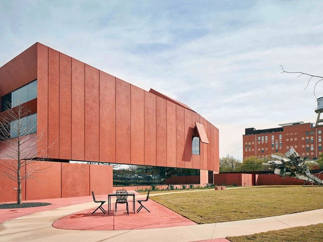 Designed by the Oklahoma City firm Rand Elliott Architects, the building devotes 8,000 sq. ft to gallery space and includes a theatre seating 200, a dance studio, nine classroom studios, a café and shops. The 4.6-acre downtown site also features a sculpture garden, an art park and a renovated 9,800 sq. ft warehouse that will house studios for ceramics, photography, fibre art, and sculpting in metal and wood.