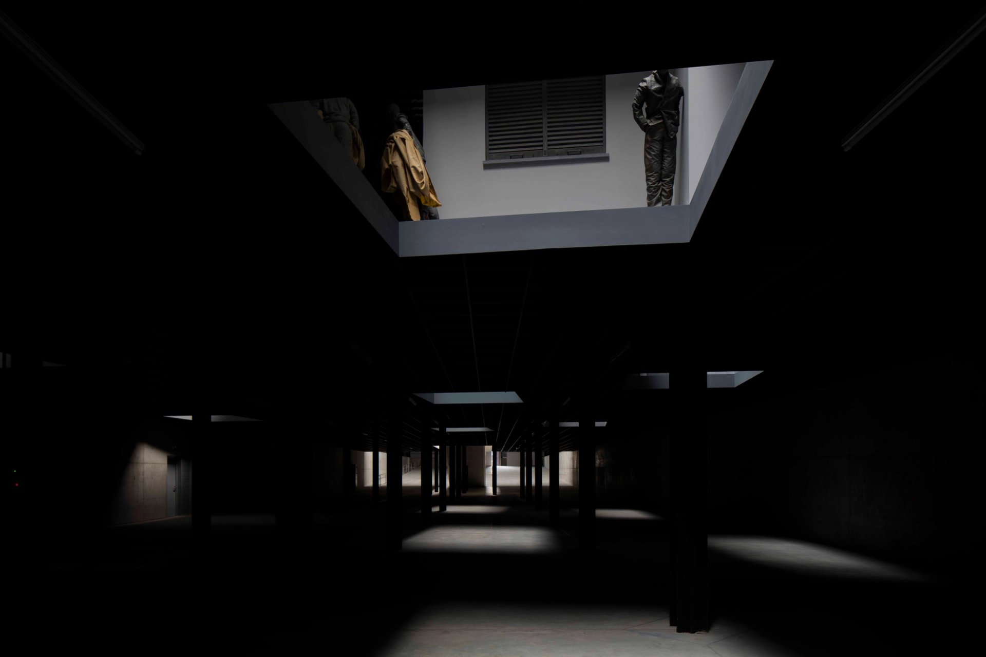 The work, which explores the ideas of spectatorship, privacy and the distortion of space, divides the cavernous venue into two floors. The ground floor is dimly lit with recesses in the ceiling in which visitors can see human figures in domestic scenes, while from the brightly-lit upper floor it is only possible to see the edges of the spaces and the figures are hidden from view. Two empty elevators slowly ascend and descend between the floors creating an eerie, monotonous mechanical sound that echoes in the vast space. “[Double Bind] is an exploration of the spaces of the modern city and of the modern mind,” said James Lingwood, the co-curator of the original commission, at the press preview of the installation.