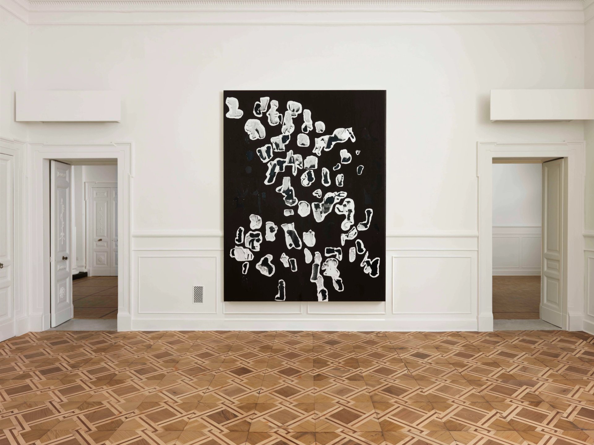But most of the works in Naples do not start with text but single letters. “I usually make paintings by starting with a specific text. But this is a departure,” says Ligon. “I started these works by drawing through letter stencils, then turning those drawings into etchings. The etchings are then turned into screenprints, some of which have white backgrounds, some have black drawn on them.”