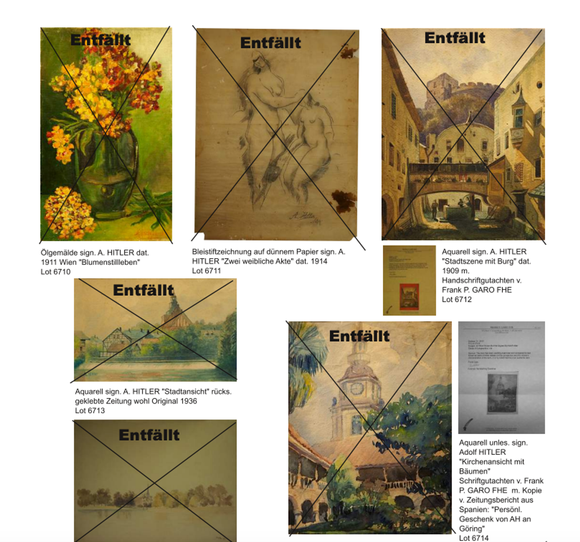 Selling such items is not illegal in Germany unless they include Nazi symbols. The prosecutor is investigating to identify possible individuals who knowingly introduced forged works into the market. The works were brought to the auction house by more than one consignor, the spokeswoman says.