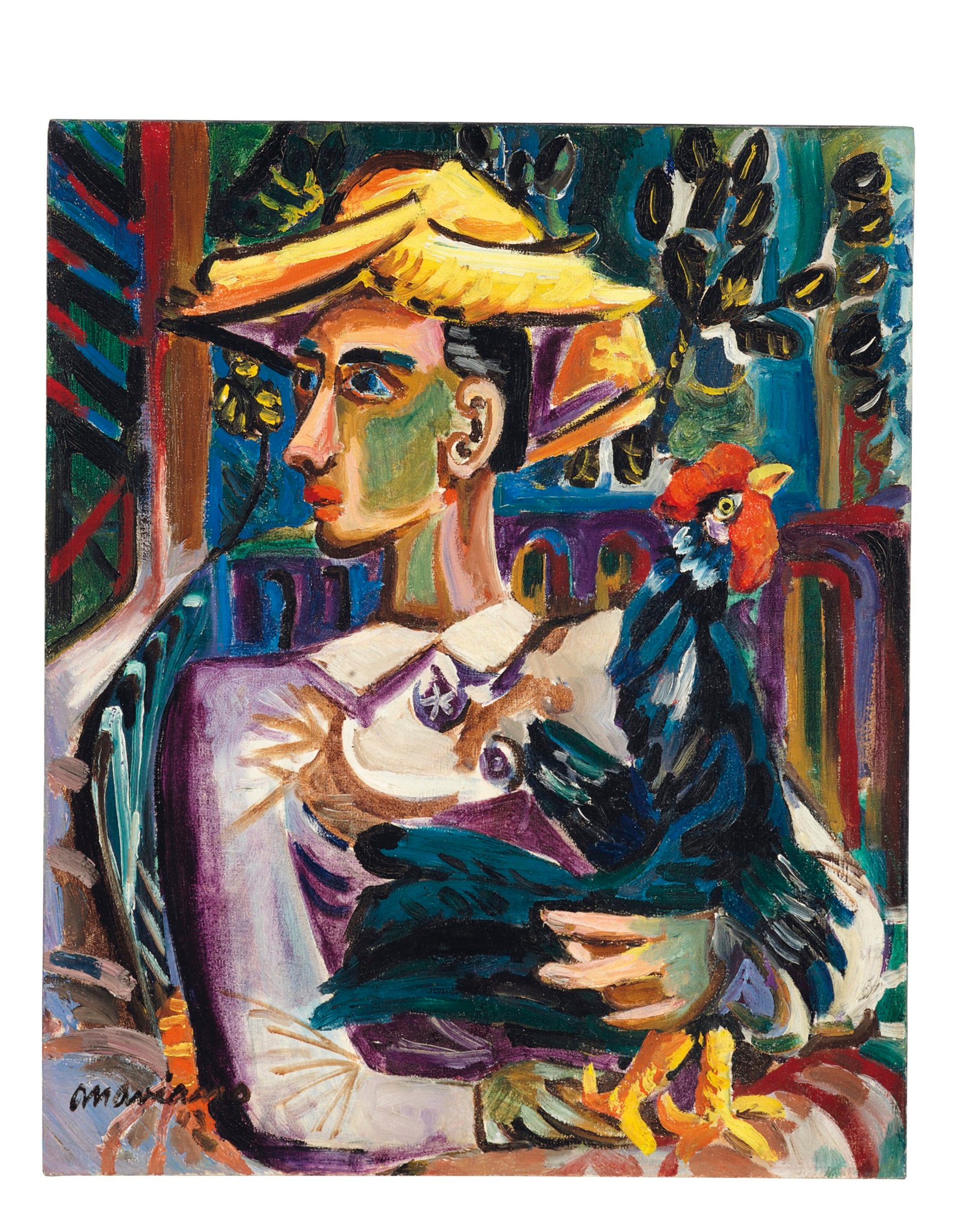 The Cuban vanguardian painted roosters in every phase of his career, sometimes rendering the animal in the fighting rink (cockfighting remains an emblematic sport of the country). This painting shows another motif that often surfaces in the artist’s work: the guajiro, a Cuban term used to describe a man from the countryside or a farmer. Together, the figures offer “a colouristic tour de force that sheds the progressive social concerns of earlier vanguardia artists for a purely pictorial, rather than sentimental, distillation of the nation”, Abby McEwen, of the University of Maryland, writes in the catalogue. The work was first shown in 1944 at the Museum of Modern Art (MoMA) in New York in an acclaimed exhibition of Modern Cuban painters organised by the museum’s founding director Alfred Barr, a proponent of Cuban art (the show travelled to The National Gallery of Art in Washington, D.C. and other American institutions). The painting last surfaced on the market at Sotheby’s in New York in 2009, where it sold for $483,000 with premium (est $125,000-$175,000).—Gabriella Angeleti